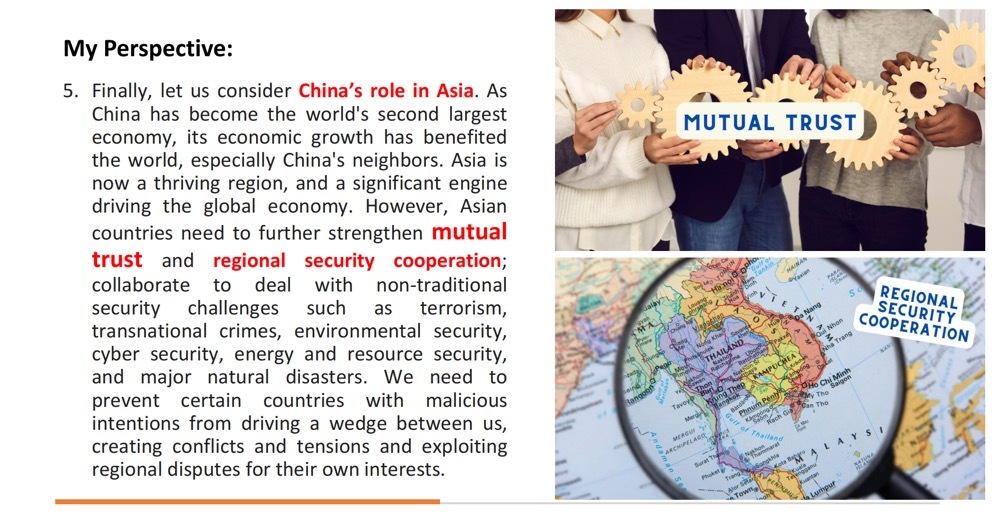 5. Finally, let us consider China's role in Asia. As China has become the world's second-largest economy, its economic growth has benefited the world, especially China's neighbors. Asia is now a thriving region and a significant engine driving the global economy. However, Asian countries need to strengthen mutual trust and regional security cooperation further; collaborate to deal with non-traditional security challenges such as terrorism, transnational crimes, environmental security, cyber security, energy and resource security, and major natural disasters. We need to prevent certain countries with malicious intentions from driving a wedge between us, creating conflicts and tensions, and exploiting regional disputes for their own interests.