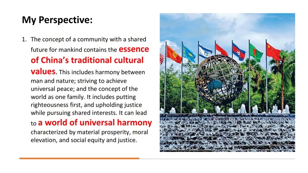 1. The concept of a community with a shared future for mankind contains the essence of China's traditional cultural values. This includes harmony between man and nature, striving to achieve universal peace, and the concept of the world as one family. It includes putting righteousness first and upholding justice while pursuing shared interests. It can lead to a world of universal harmony characterized by material prosperity, moral elevation, and social equity and justice.