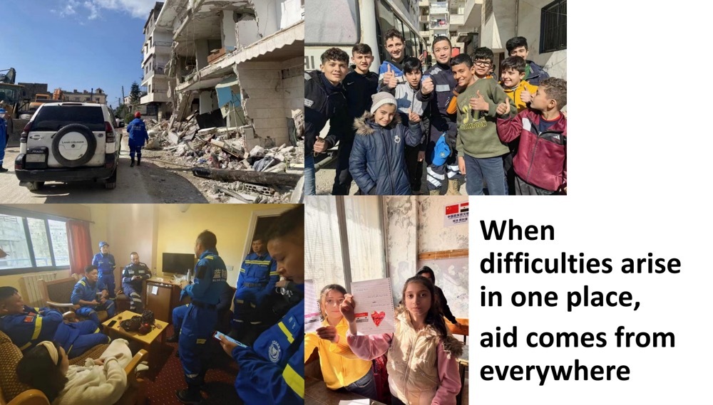 Today, I want to start by sharing with you about my neighbor in my hometown. As we all know, in early February of this year, the Syrian-Turkish border region was struck by the most devastating earthquake in over a century. Shortly after the earthquake, Jianfeng You, my neighbor, volunteered at his own expense to lead the Blue Leopard rescue team from China's Fujian Province to go to the disaster-stricken area to aid in the rescue efforts. This is a typical example of how the Chinese people are willing to help those to whom they have no relation. This compassionate and helpful mindset stems from the heart, and is also nourished by the deep roots of Chinese civilization and traditional culture.
