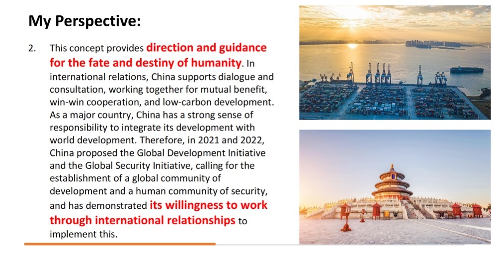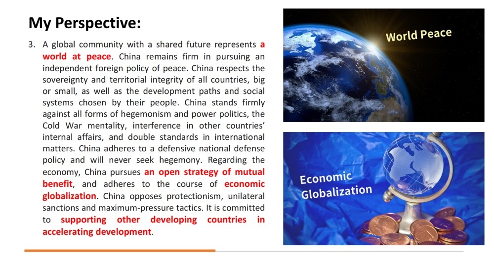 Xi Jinping has said: "As the term suggests, a community with a shared future for mankind means that the future of every nation and country is interlocked. We are in the same boat and we should stick together, share weal and woe, and endeavor to build this planet of ours into a single harmonious unit, turning people's longing for a better life into a reality." As a Chinese, I strongly support this concept,and I hope that through today’s meeting, this vision can be better understood around the world. From my perspective,