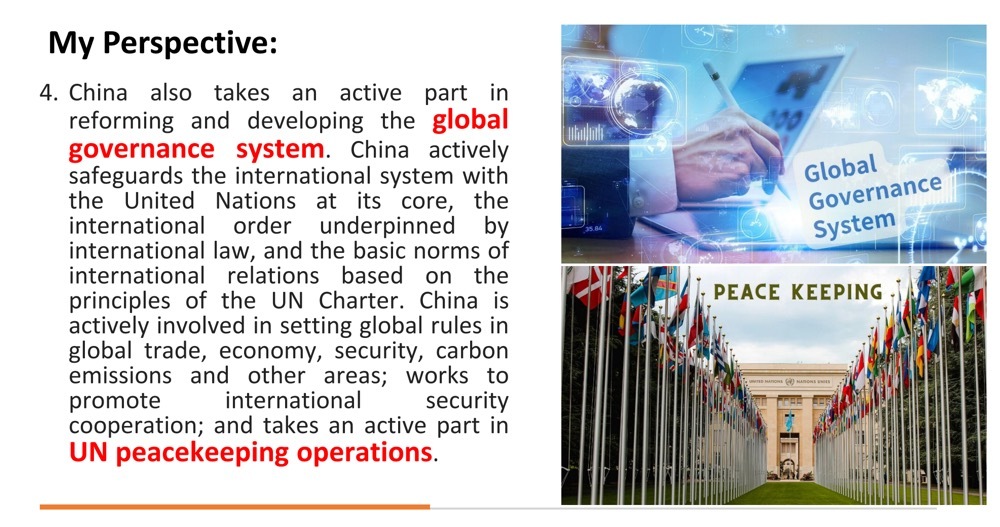 4. China also takes an active part in reforming and developing the global governance system. China actively safeguards the international system with the United Nations at its core, the international order underpinned by international law, and the basic norms of international relations based on the principles of the UN Charter. China is actively involved in setting global rules in global trade, economy, security, carbon emissions, and other areas; works to promote international security cooperation; and takes an active part in UN peacekeeping operations.