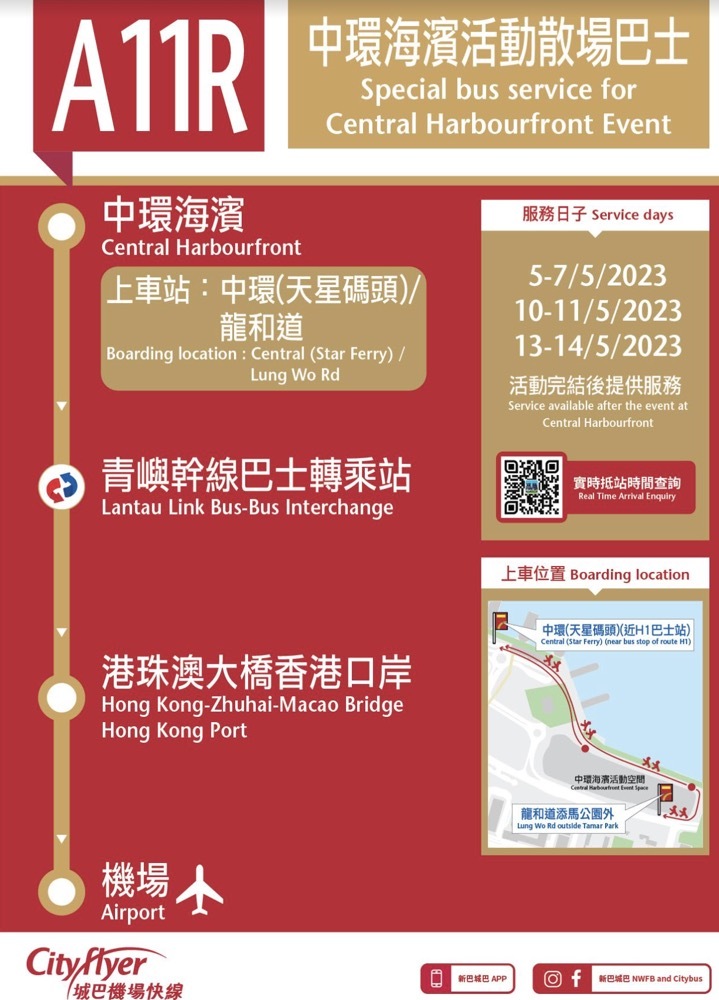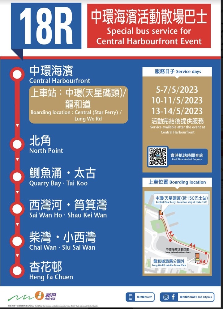 Citybus and New World First Bus ("NWFB") will operate three special routes after the Jay Chou "Carnival" Hong Kong Concert 2023 from 5 to 7 May, 10 to 11 May and 13 to 14 May, facilitating customers to travel from Central Harbourfront to various districts.