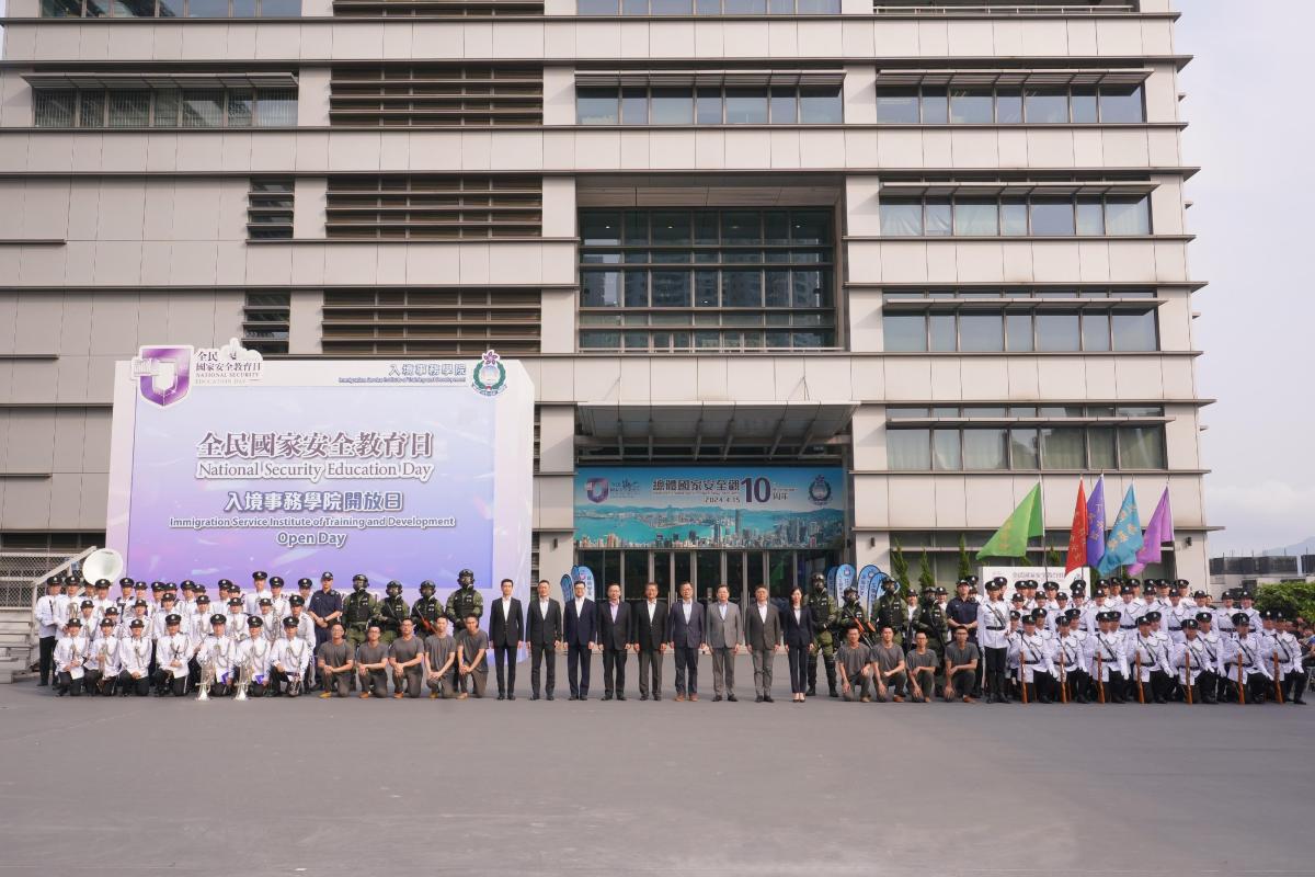 The Financial Secretary, Mr Paul Chan, accompanied by directorate officers of the ImmD, attended the open day to visit exhibition booths and watch performances with members of the public. The Immigration Band took the lead in playing multiple pieces of uplifting music and performed a spectacular band drill. As this year marked the 10th anniversary of President Xi Jinping's proposal of the Holistic Approach to National Security, the Departmental Contingent held flags printed with the Five Essential Elements of the Holistic Approach to National Security to perform Chinese-style foot drill, as well as lined up to form a pentagon symbolizing the Five Co-ordination Tasks of the Holistic Approach to National Security. Besides, the Emergency Response Team of the Castle Peak Bay Immigration Centre demonstrated how to handle emergencies professionally and promptly with the use of various firearms and anti-riot equipment, which showcased the ImmD's response capabilities to deal with incidents that endangered public security.