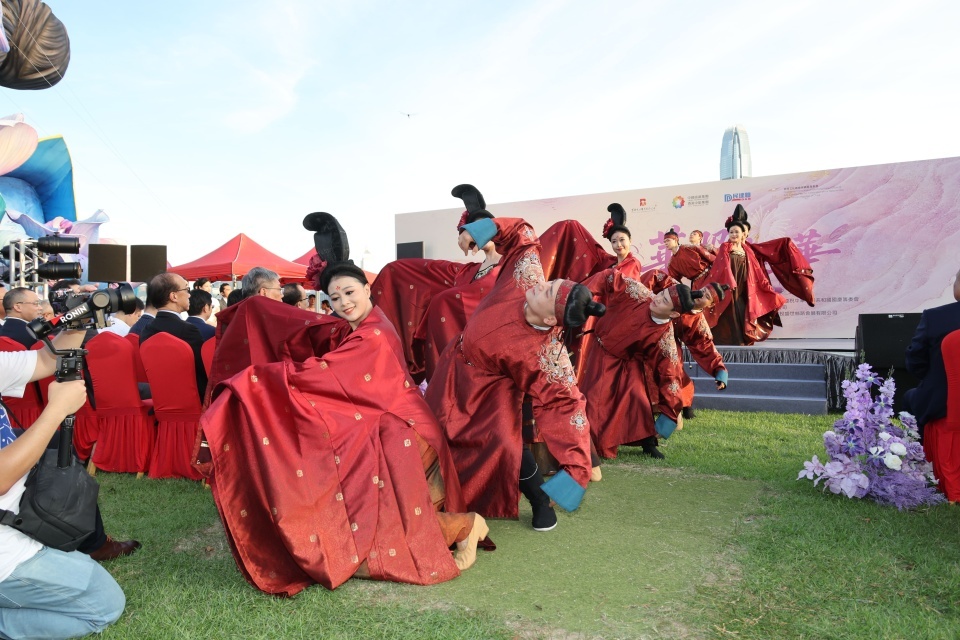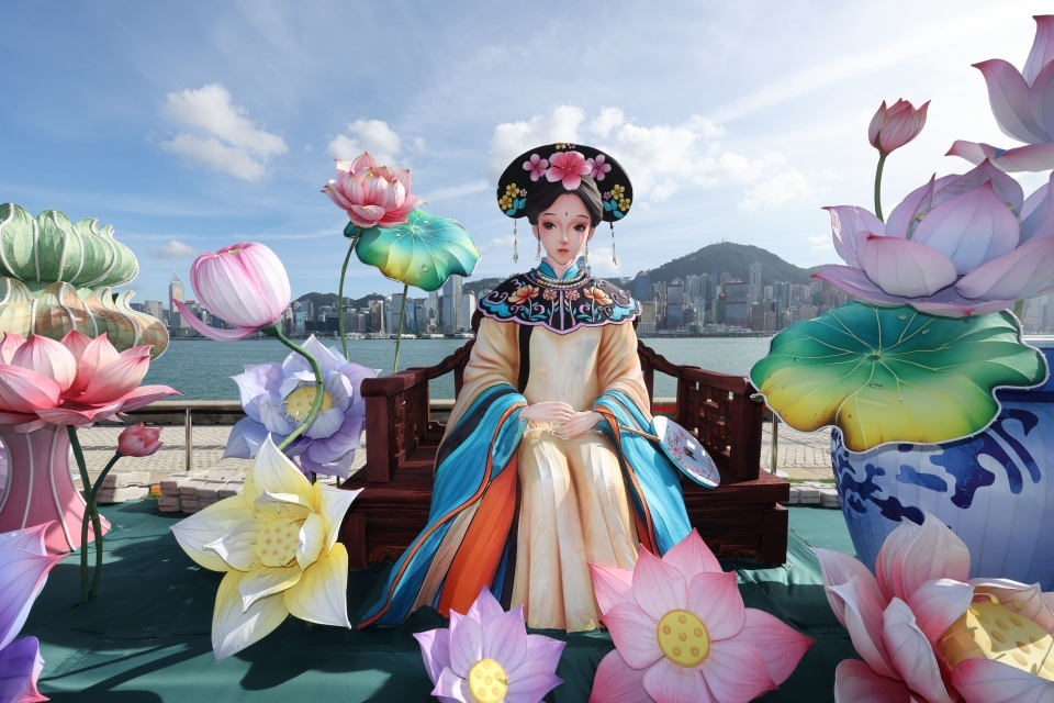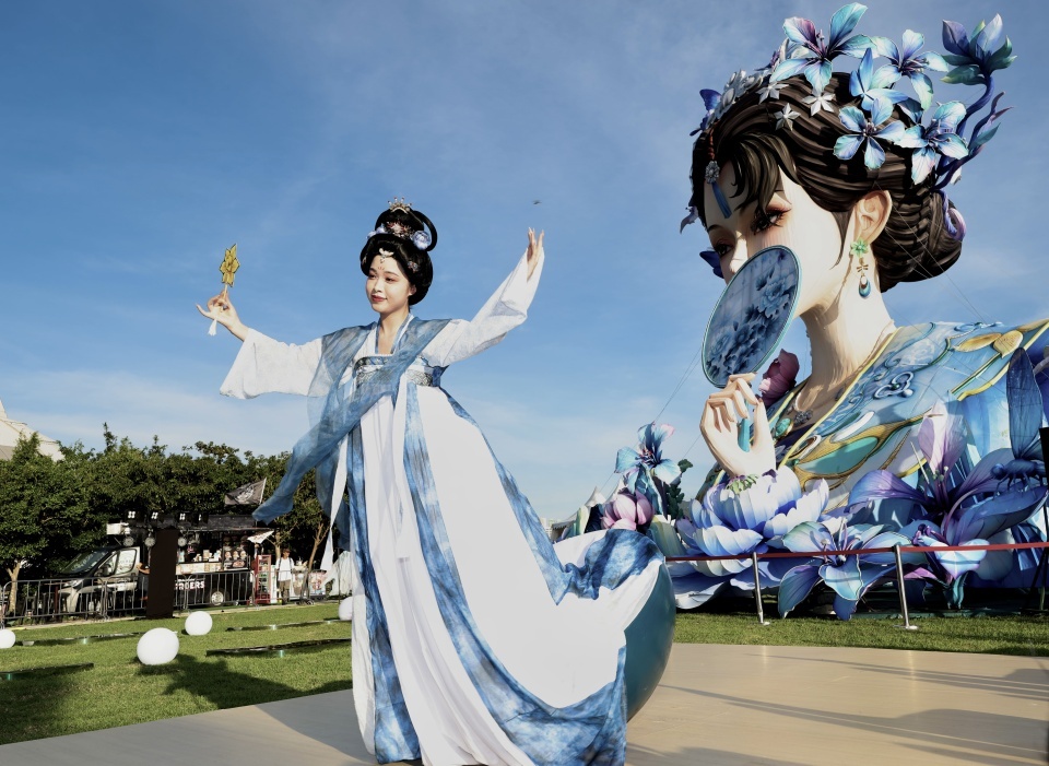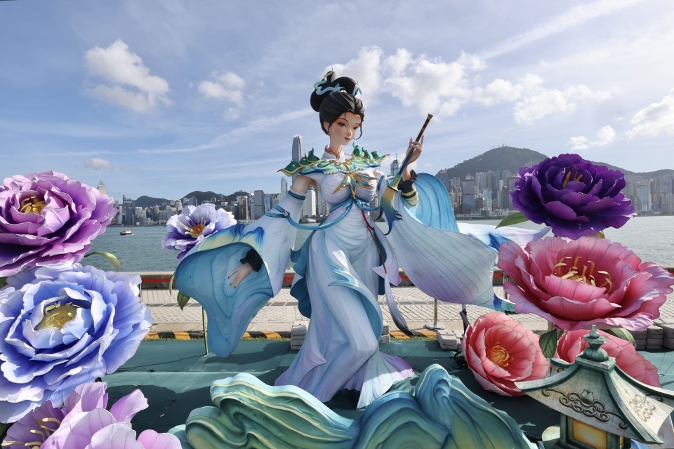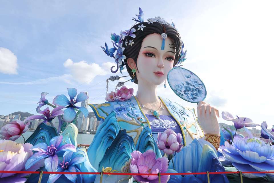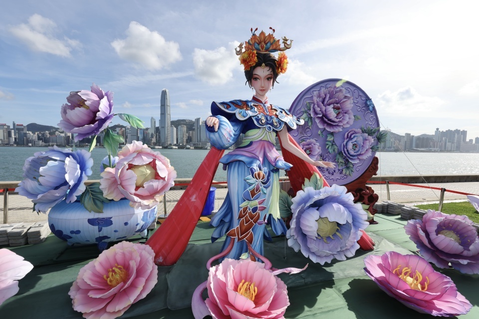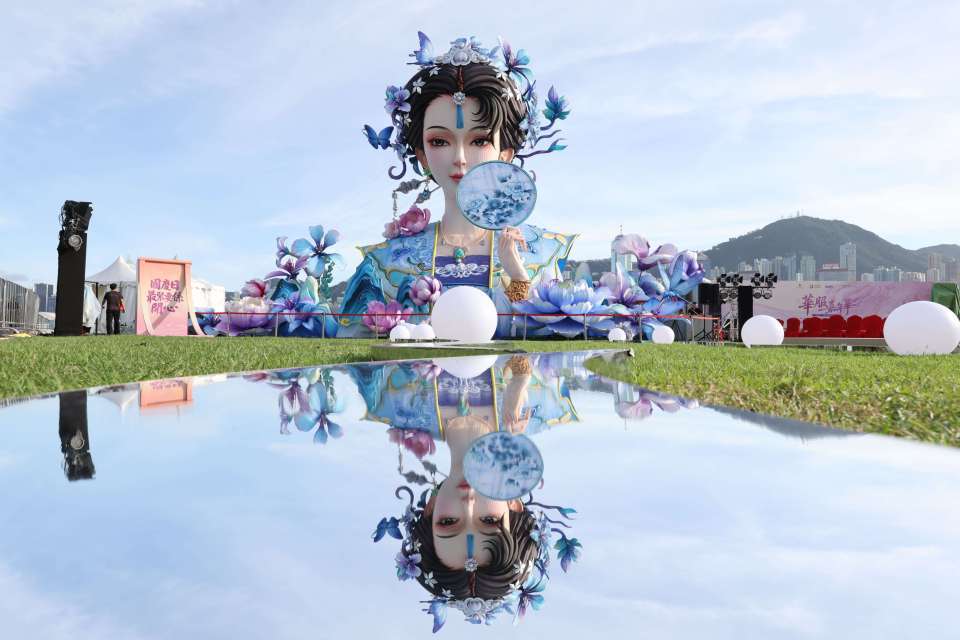 The celebration of the National Day, Chinese costume carnival, takes place from September 29 to October 2 at the east lawn of the West Kowloon Cultural District Art Park, with free admission. A highlight of the event is the giant floral lantern display themed "Fairy of Hong Kong," consisting of four large lanterns. The most striking lantern, named "Fairy Zixia," stands at an impressive 12.8 meters, making it the largest single-character floral lantern currently exhibited in Hong Kong.