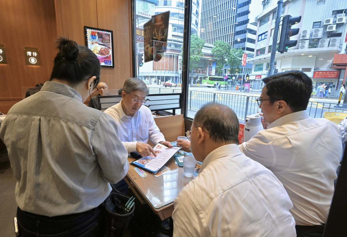 Cheuk mentioned that after attending the flag-raising ceremony and reception for the 76th anniversary of the founding of the People's Republic of China this morning, he, along with the Deputy Secretary for Financial Services and the Treasury, Michael Wong, the Deputy Secretary for Justice, Horace Cheung, and the Secretary for Constitutional and Mainland Affairs, Erick Tsang, went to a tea restaurant in Wan Chai offering a 30% discount on all items for the National Day, where they enjoyed a Hong Kong-style breakfast.