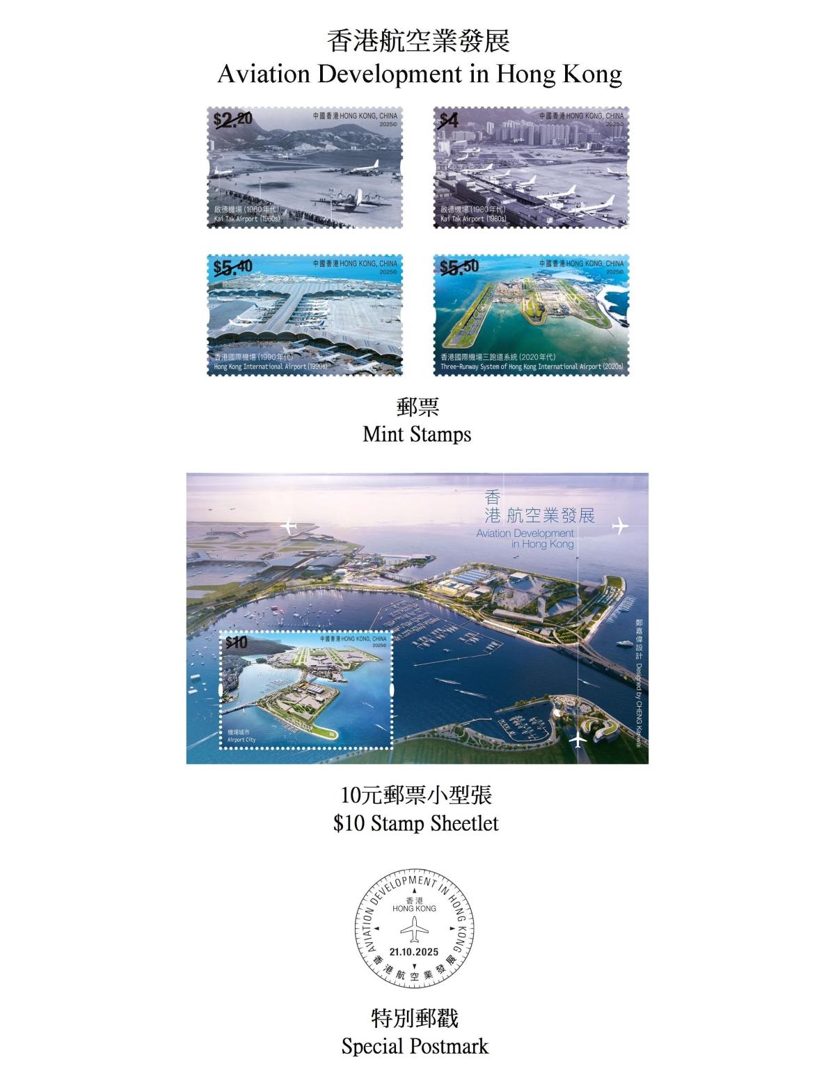 Hongkong Post announced today (Oct. 3) that a set of special stamps and associated philatelic products on the theme of "Aviation Development in Hong Kong" will be released for sale on October 21 (Tuesday).