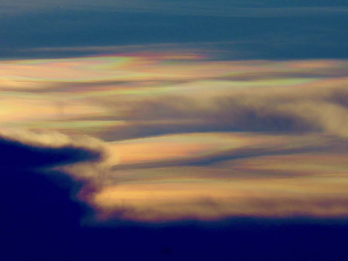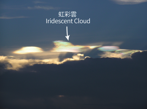 The Observatory noted, "Cloud with rainbow colours is called 'iridescent cloud'. It is a special optical phenomenon usually observed in altostratus or altocumulus clouds near the Sun when sunlight diffracts through tiny water droplets or ice crystals of fairly uniform size in clouds. When diffraction of light occurs in a larger layer of cloud, corona may appear."