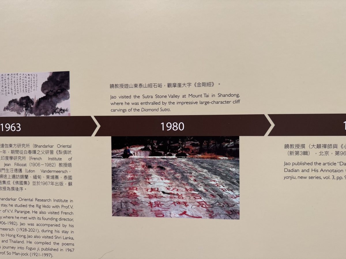 When talking about Jao Tsung-I's connection with the Heart Sutra, Dr. John Yiu, Deputy Director of the Jao Tsung-I Petite Ecole, revealed that Jao was deeply inspired by stone carvings during a visit to Mount Tai in Shandong in 1980, and began writing the Heart Sutra in large-font scripts in 2001. "He paid special attention to the various ways of writing the character 無 (wu, meaning nothingness) and the rhythm of pauses between sentences. His early creations were influenced by renowned masters, but in his later years, he wrote with complete freedom, fully demonstrating the state of brush and ink following the heart."