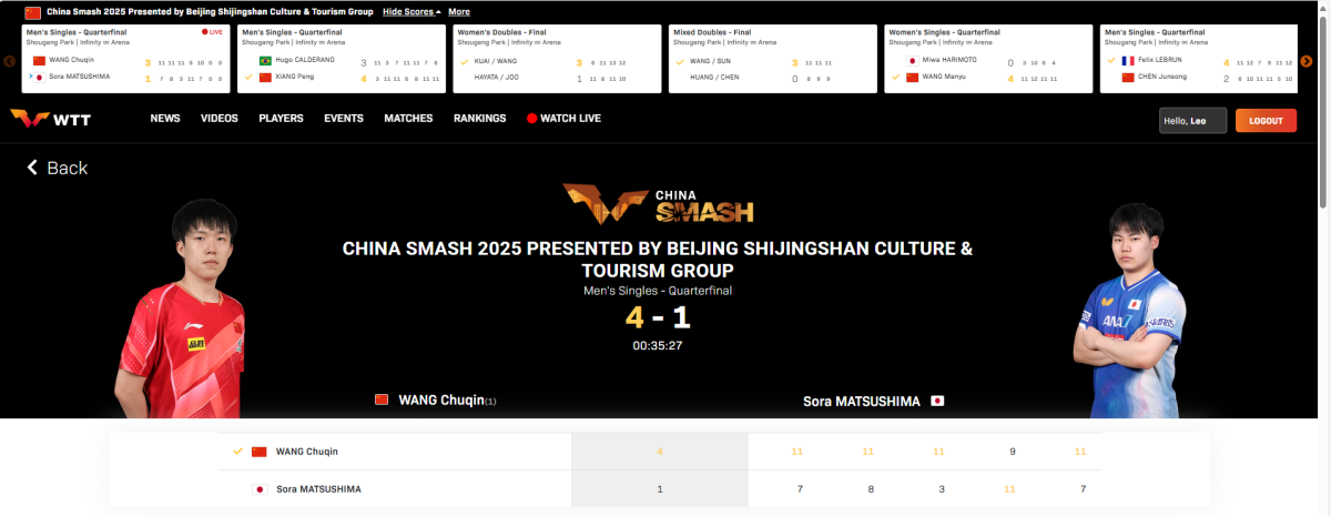 In today's (Oct. 4) WTT China Smash men's singles quarterfinals, China's table tennis star Wang Chuqin faced off against Japan's Sora Matsushima. Wang delivered a dominant performance, defeating Matsushima 4–1 to secure his spot in the semifinals.