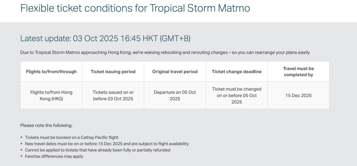 In response to the typhoon, Cathay Pacific has announced on its official website that rebooking fees for flights departing on Oct. 5 will be waived. The fee waiver applies to tickets issued on or before Oct. 3. Passengers must complete any ticket changes by Oct. 5.