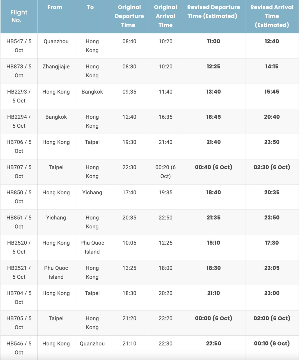 Meanwhile, Greater Bay Airlines has also adjusted its flight schedule due to the typhoon, with the following 13 flights affected: