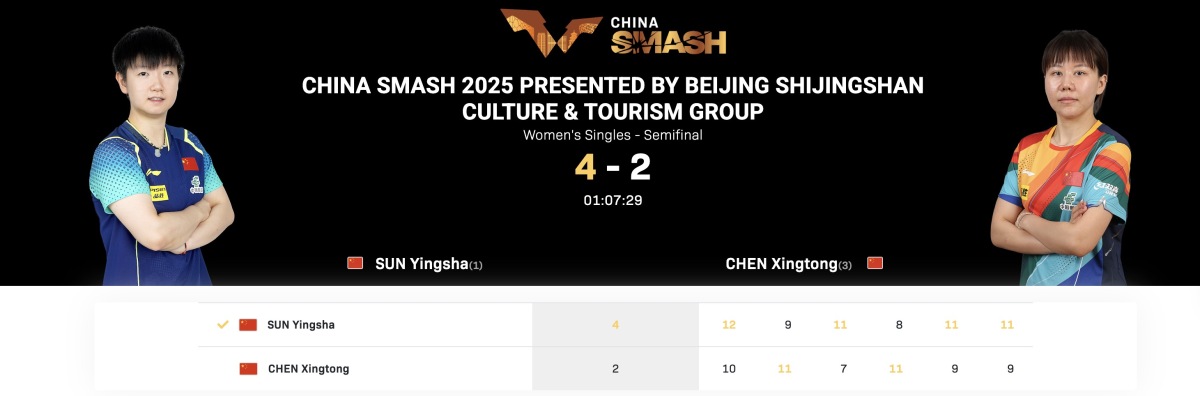 In a highly intense WTT China Smash women's singles semi-final match today (Oct. 4), China's table tennis star Sun Yingsha faced her teammate Chen Xingtong in a gripping battle for a spot in the finals. The match, marked by evenly matched performances from both players, saw Sun Yingsha prevail with a 4–2 victory after six fiercely contested games.