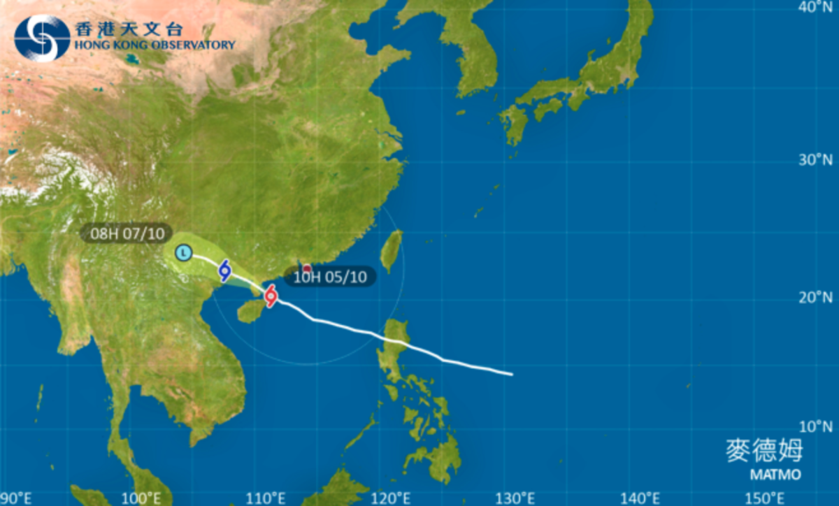 Over the past few hours, Matmo skirted more than 300 kilometres to the southwest of Hong Kong and departed gradually. However, under the influence of the outer rainbands of Matmo, local winds are still strong at first, occasionally up to gales offshore and on high ground. There will be occasional squally showers, thunderstorms, and intense gusts.