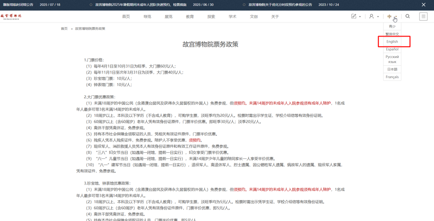 - Go to the official website of the Beijing Palace Museum and switch the language to English.