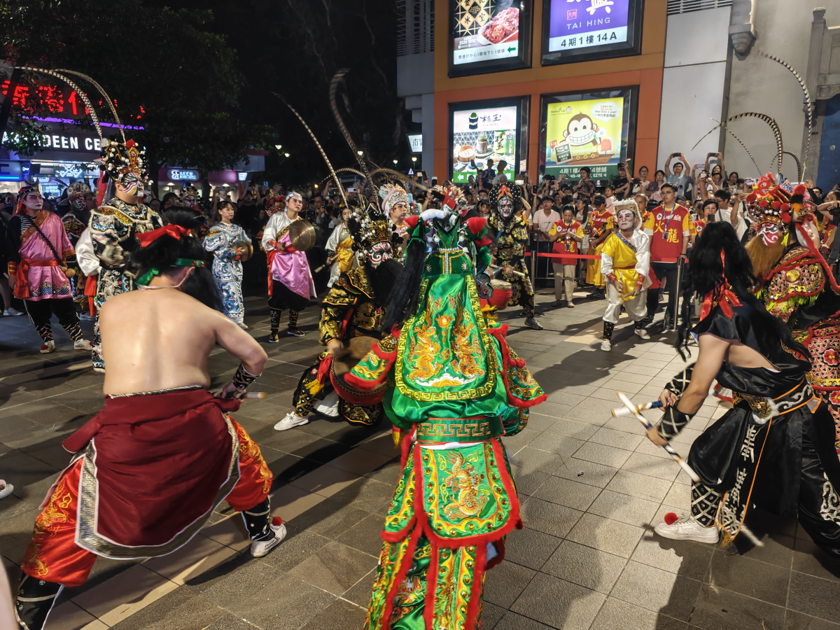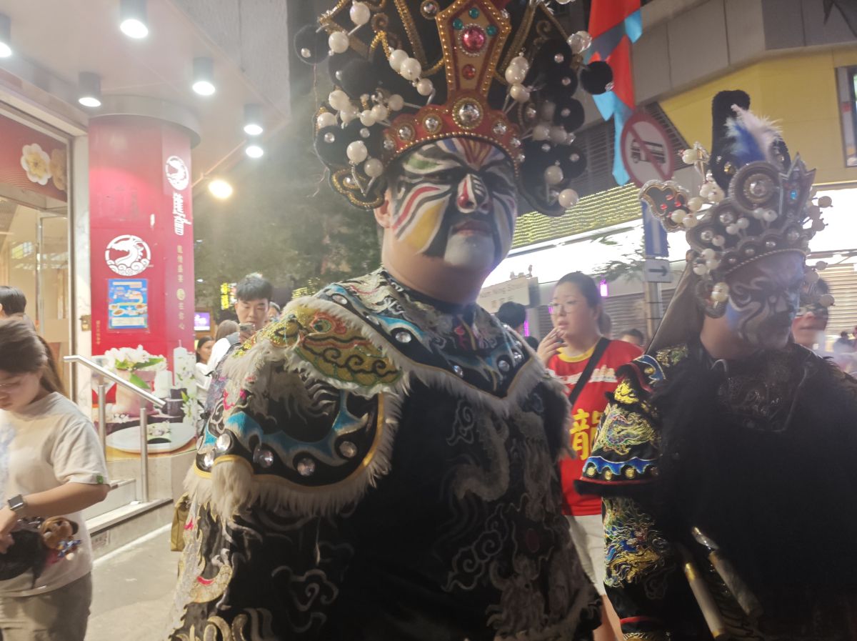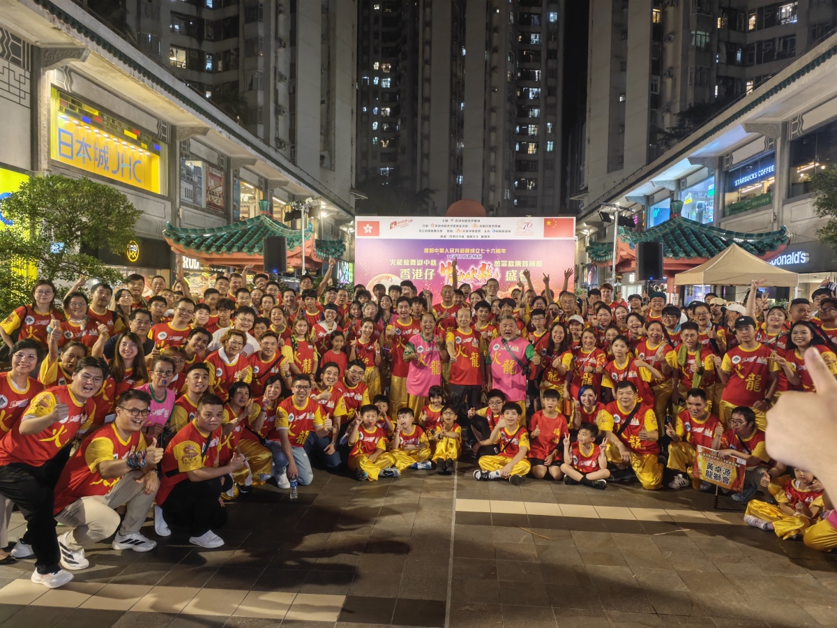 After nearly two hours of continuous performances, the Yingge dance team concluded their segment around 10:00 p.m. Many spectators rushed to take photos with them. One performer, Mr. Choi, shared his passion for Yingge dance. Although he works in Shenzhen selling electronic products, he transforms into a Yingge dancer whenever there's an event. He deeply appreciated the warm reception from HK citizens and enthusiastically declared with his teammates: "We'll be back next time!"