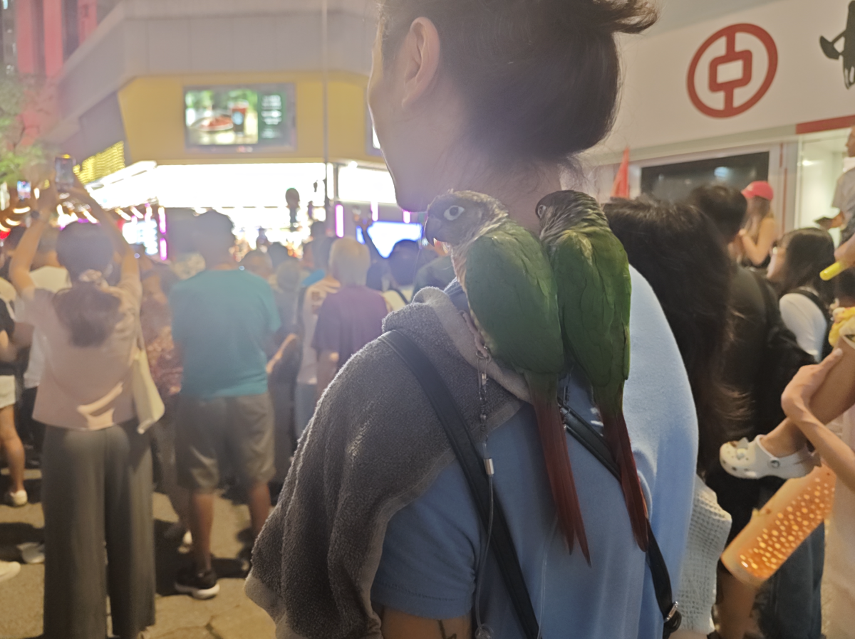 Another spectator, Mr. Cheung, brought his two pet parrots to watch the fire dragon performance. He shared that he lives in Kowloon and rarely visits HK Island, let alone watches a fire dragon dance. This time, he came specially to Aberdeen for the event and praised the performance as spectacular and lively. Laughing, he said that since the fire dragon has a history of over a century, he wanted his parrots to experience a piece of HK's traditional culture as well.