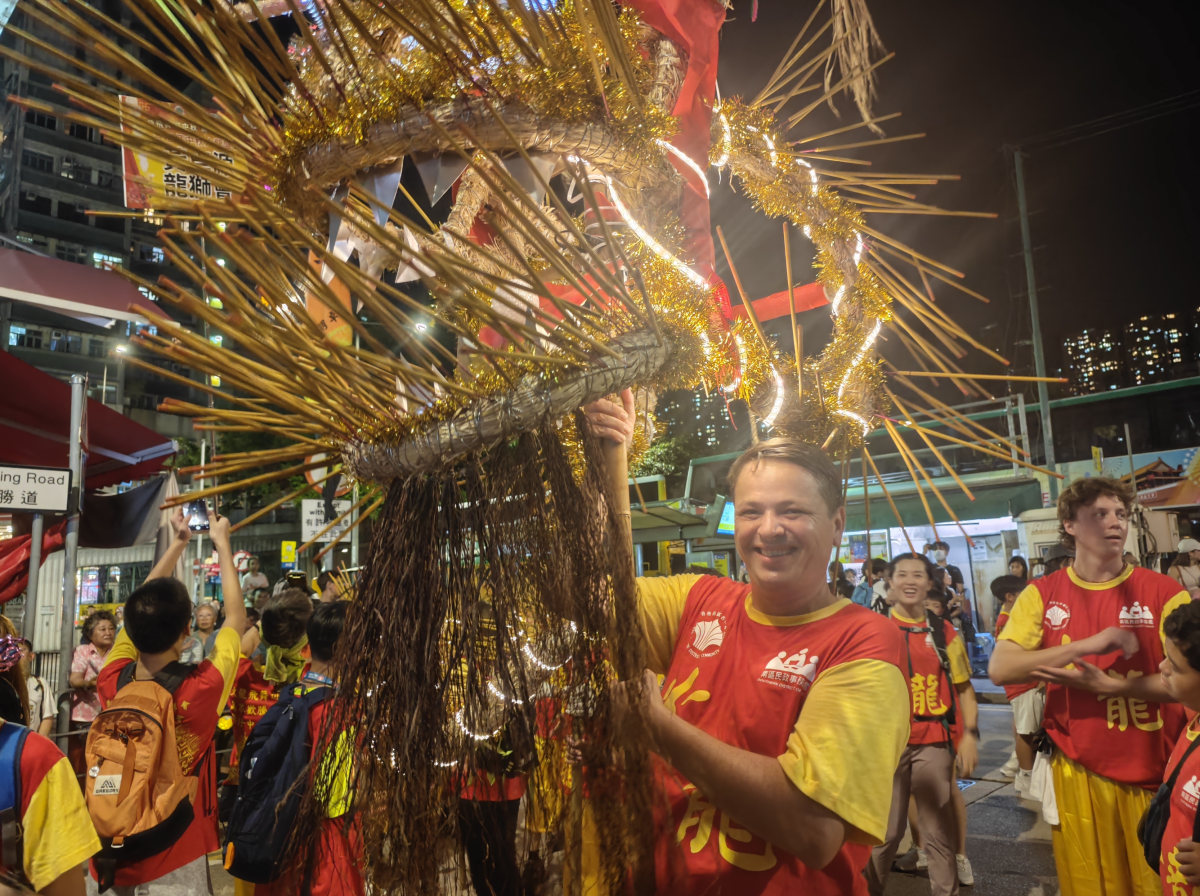 James, a 46-year-old resident of Lamma Island who was born and raised in HK, shared his excitement about leading the fire dragon for the first time, even though he was no stranger to fire dragon dances. His daughter participated as a member of the dragon dance team, which gave him the opportunity to join as well. He expressed how unique the experience felt, especially when holding the dragon's head, which was particularly heavy. He described the moment people reached out to touch the fire dragon as almost sacred, giving him a sense of great responsibility.