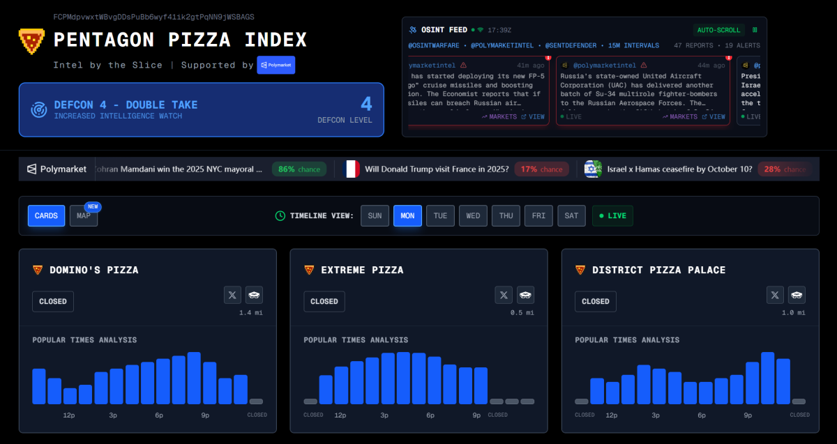 The "Pentagon Pizza Index" is monitored by platforms like Pizzint, which tracks pizza orders near the Pentagon. The concept gained traction online due to the common American practice of ordering pizza during overtime work. By analyzing order volumes from pizzerias around the U.S. Department of Defense headquarters, the index attempts to predict potential military activities based on inferred overtime patterns, attracting significant public curiosity.