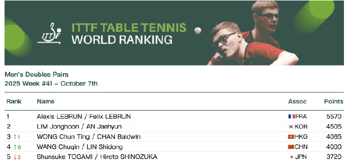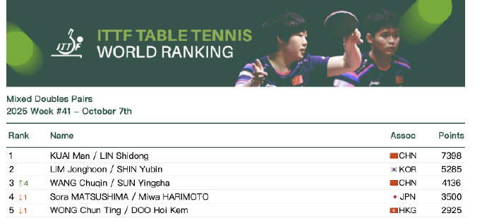 China also shines in doubles rankings. Kuai Man and Lin Shidong are ranked No. 1 in mixed doubles, while Wang Chuqin and Sun Yingsha's mixed doubles pairing rises to No. 3. In men's doubles, Wang Chuqin and Lin Shidong currently hold the No. 4 spot.