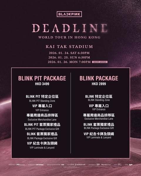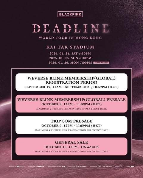 BLACKPINK's Hong Kong leg of their world tour will take place from Jan. 24 to 26, 2026, at the Kai Tak Sports Park. The initial two shows on Jan. 24 and 25 were completely sold out back in June. Due to overwhelming demand, an additional show on Jan. 26 has been announced, and tickets for the new date will be released in three phases: fan presale on Oct. 8, Trip.com exclusive sale on Oct. 9, and public sale via Cityline on Oct. 10.