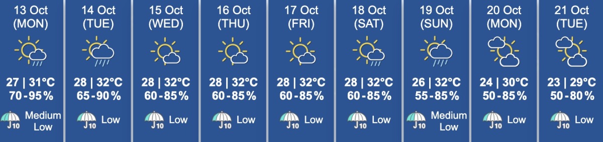 For today (Oct. 13), there will be periods of sunshine, scattered showers, and isolated thunderstorms in some areas in HK. Tomorrow, the weather is expected to feature brief sunny intervals and one or two isolated showers.