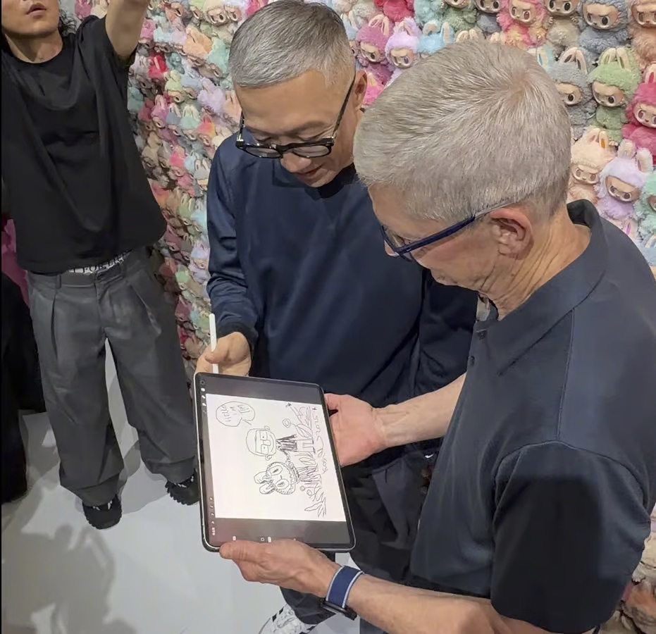 During the visit, Lung showcased various artworks and sources of inspiration to Tim Cook, introducing the creative background of the Labubu family. He even demonstrated how to draw Labubu using an iPad Pro, highlighting the fusion of technology and trendy toys.