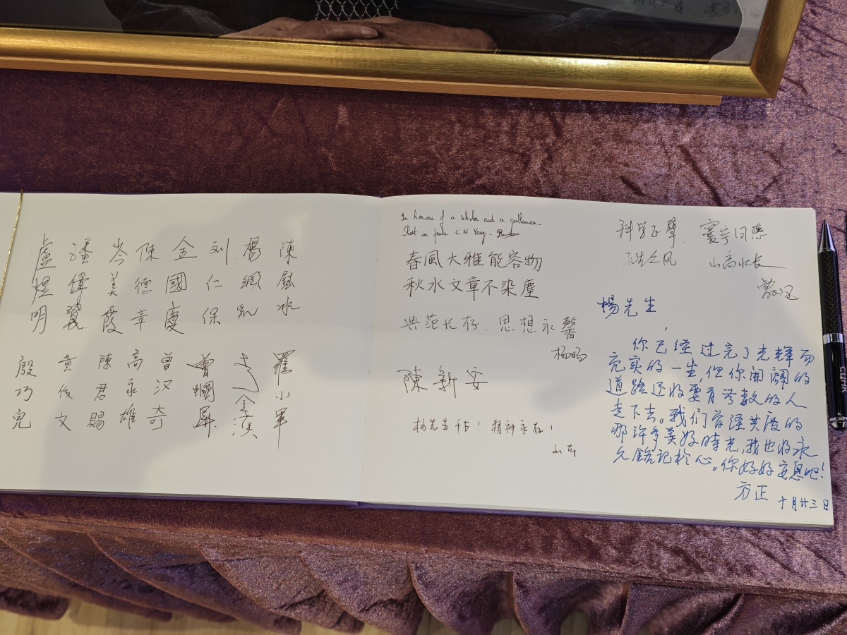 Professor Chen Fong-ching, an 85-year-old Emeritus Fellow at CUHK, remembered his friend, stating that Yang's research was crucial for fundamental theoretical physics. He praised Yang as "a truly great man" and wrote in the condolence book: "Professor Yang, you have lived a splendid life. Your legacy will inspire many. The memories we shared will remain in my heart. Rest in peace."