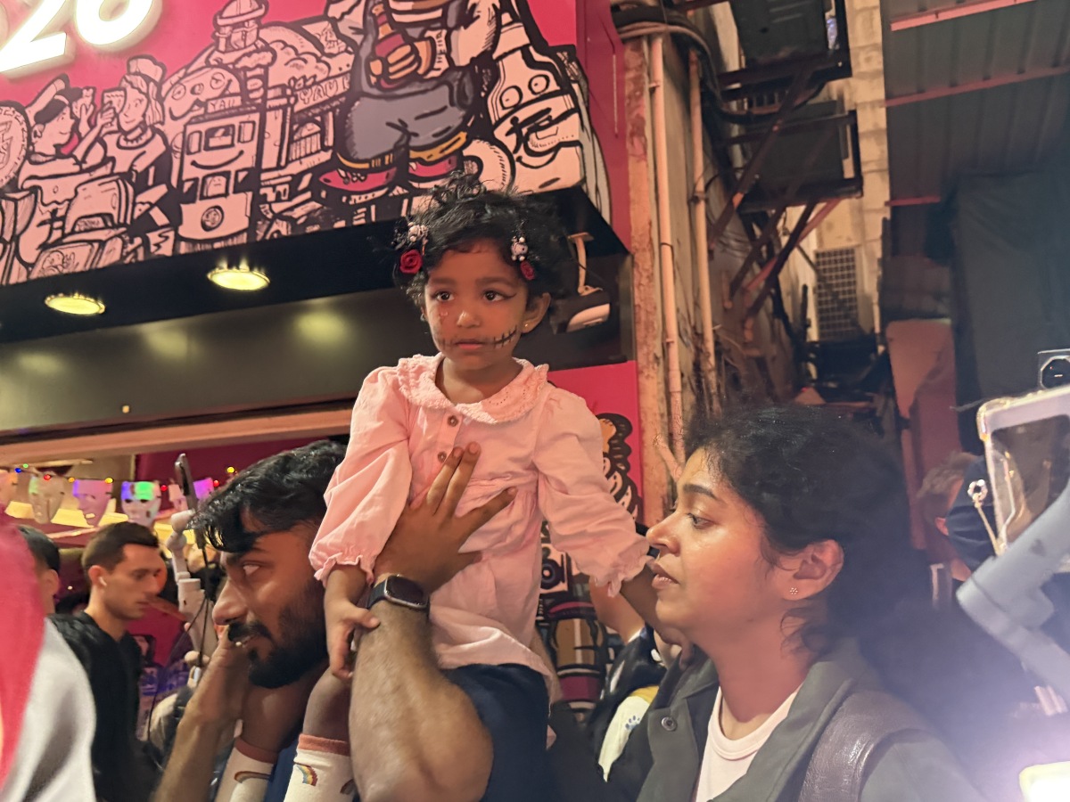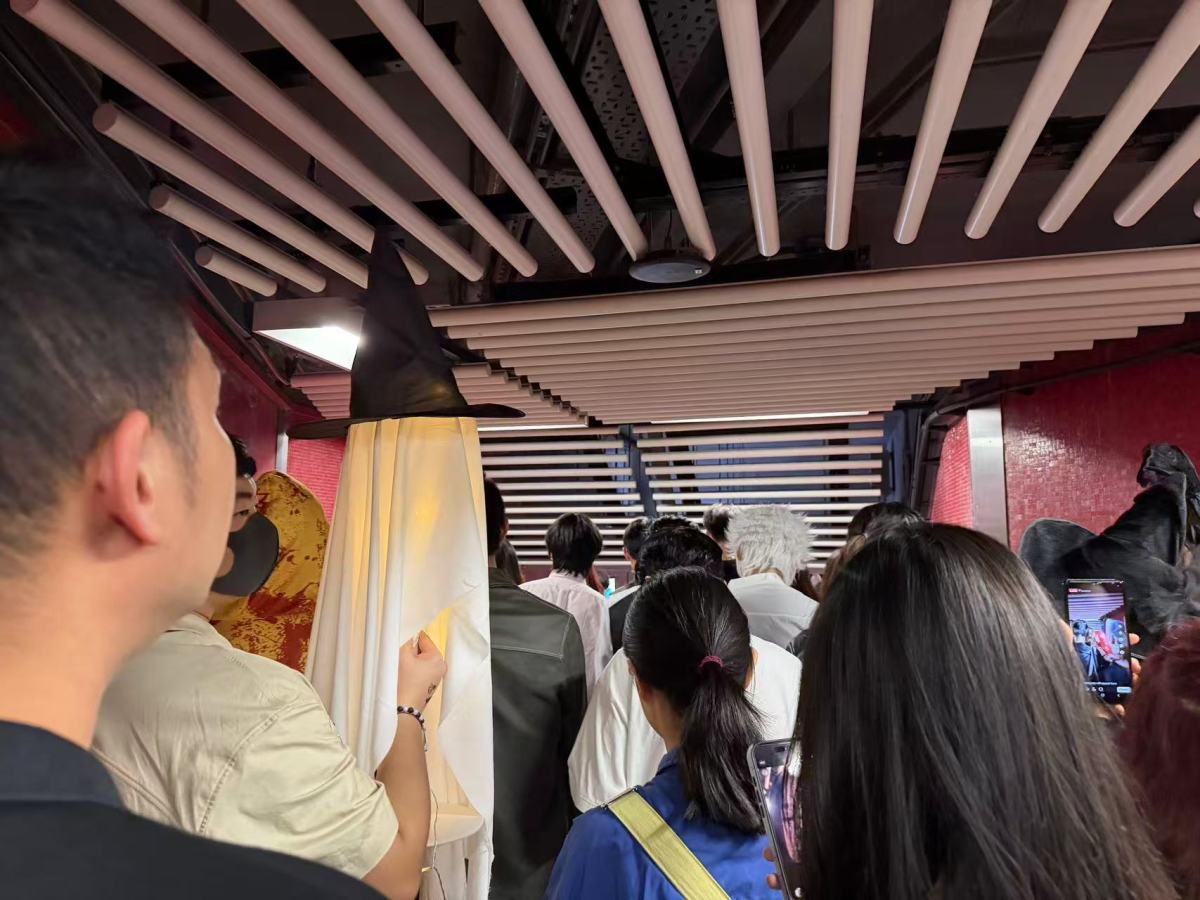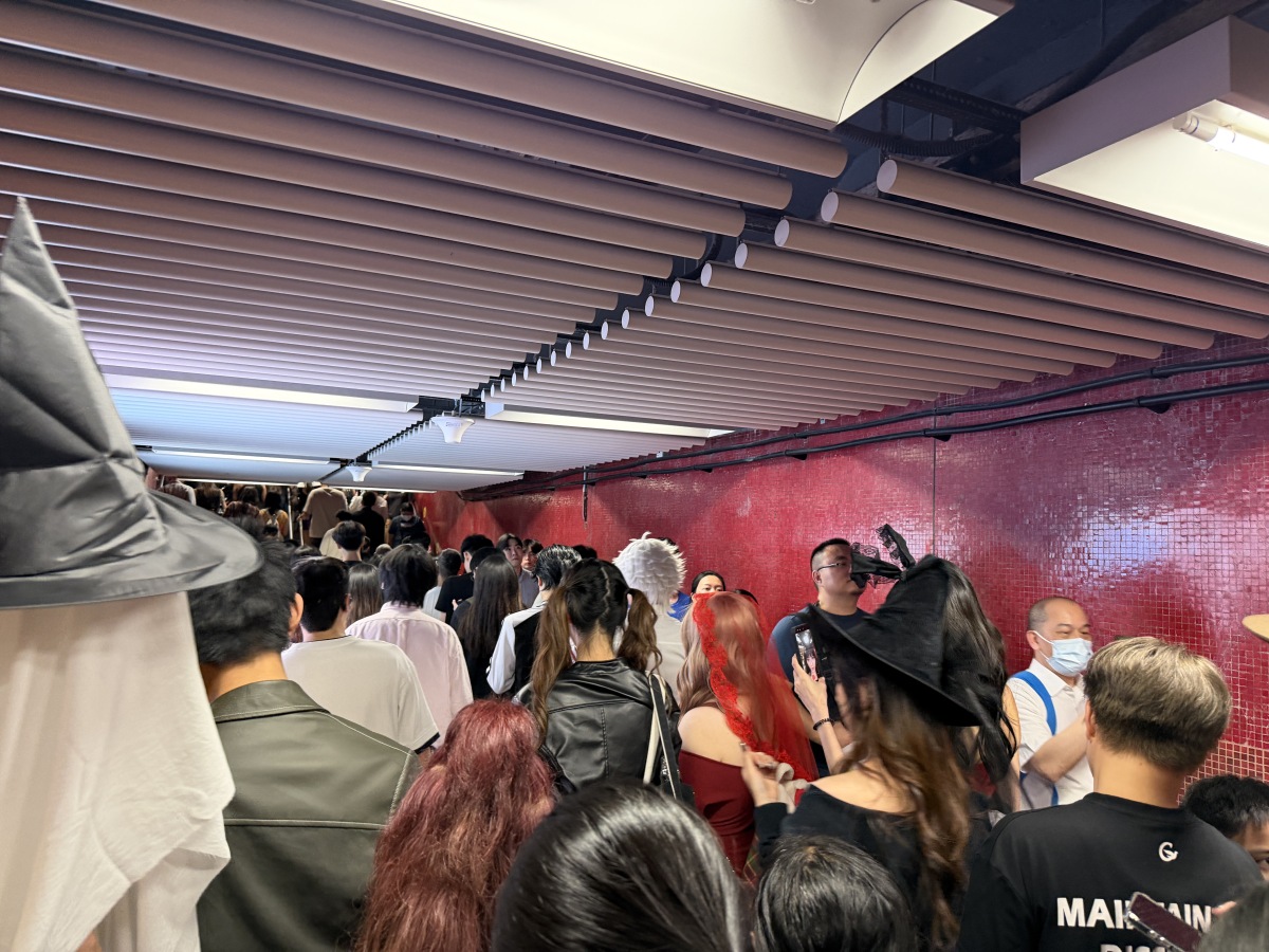 The exit was completely jam-packed, with long lines of costumed attendees gathering in the area. The festive atmosphere was palpable, with people dressed in all kinds of creative and spooky Halloween outfits.