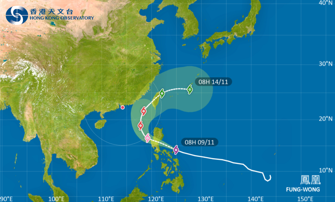 Under the combined effects of the monsoon and "Fung-wong," the weather in Hong Kong will be slightly cooler with strong winds on Tuesday and Wednesday (Nov. 11 and Nov. 12). Additionally, from tonight to tomorrow morning (Nov. 10), there will be rough to very rough seas in the northern and central parts of the South China Sea, with waves reaching 6 to 9 meters. The Taiwan Strait and the waters east of Taiwan will see large to huge waves of 3 to 5 meters; the coastal waters of Fujian will experience large waves of 2.5 to 3.8 meters, while the southern Zhejiang and eastern Guangdong coastal waters will see moderate to large waves of 2 to 3 meters.