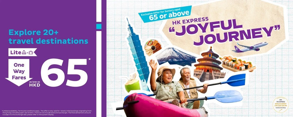 To celebrate Senior Citizens' Day on Nov. 16, HK Express has launched a special flash promotion, "Joyful Journey", offering unbeatable deals for seniors aged 65 and above. Eligible HK and Macao residents can purchase one-way economy class tickets to over 20 popular Asian destinations starting from just HK$65.