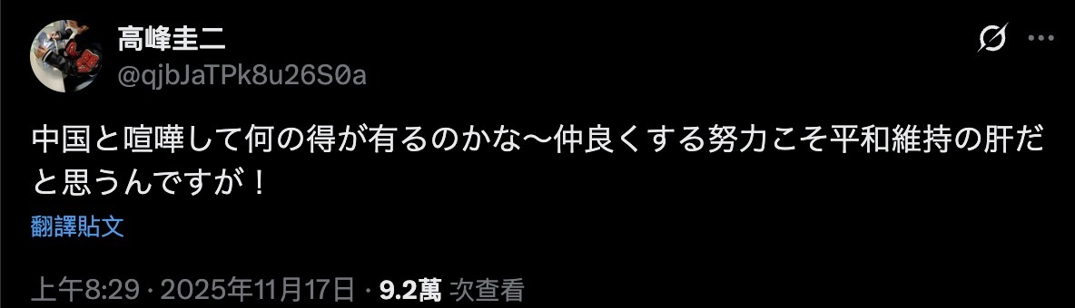 "What's the point in quarreling with China?" Japanese actor Keiji Takamine, the protagonist in Ultraman Ace, asked in his X post on Monday (Nov. 17).