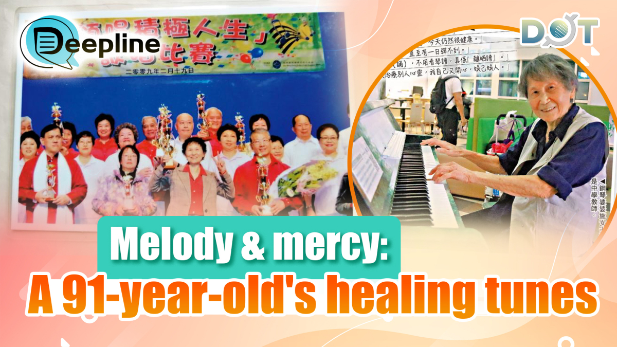 Every day at 4:30 pm, melodious piano music fills the lobby of North District Hospital in HK. Classic tunes such as Love Always Everywhere, The Bund, and Thoughts of Kindness draw many passers-by to stop and listen. The pianist is 91-year-old Grandma Cindy, with her good partner, Sau Lan, singing beside her. Recently, viral videos show Grandma Cindy playing numerous pieces fluently without sheet music, earning praise from netizens as "a hidden musical gem among the public".