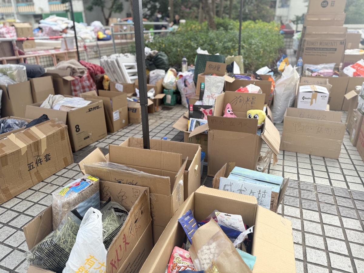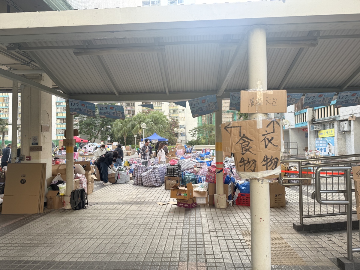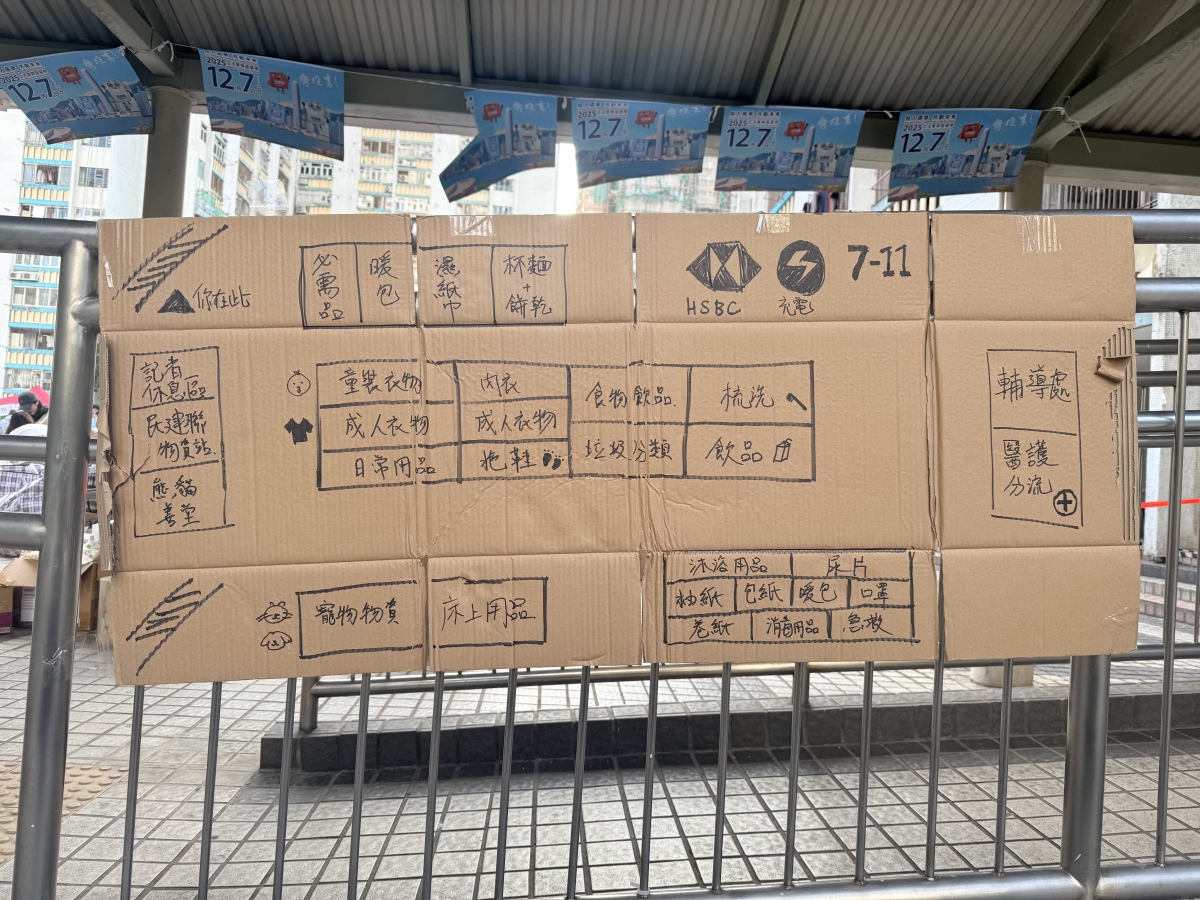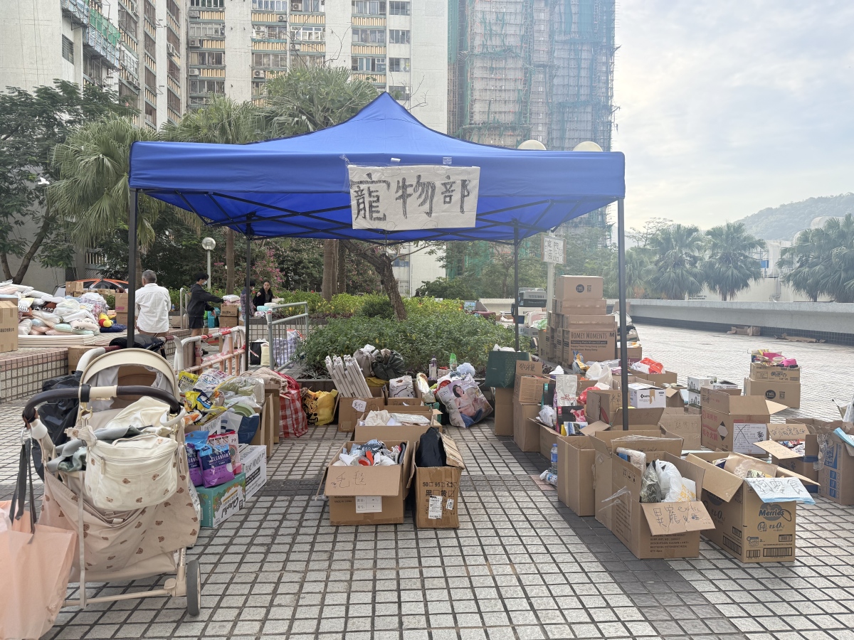 Additionally, around 8 am this morning, volunteers began arriving on the rooftop of Kwong Fuk to distribute supplies to residents. In addition to common items like clothing and food, a pet supplies section was also available, providing dog food, cat food, and pet snacks. There were also homemade cardboard signs created by citizens indicating the distribution areas for various supplies, a rest area for reporters, and a charging station.