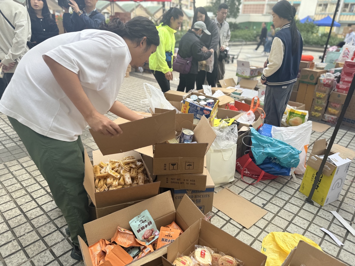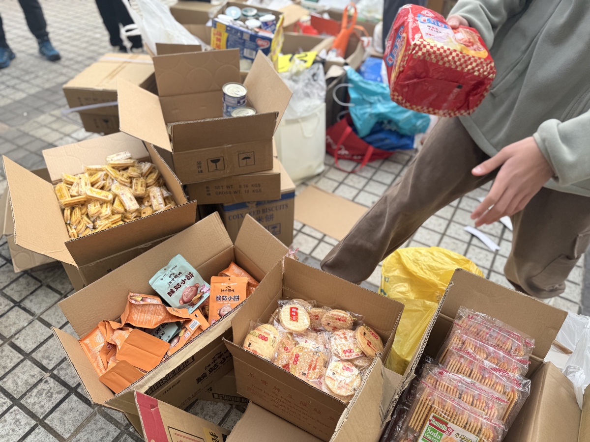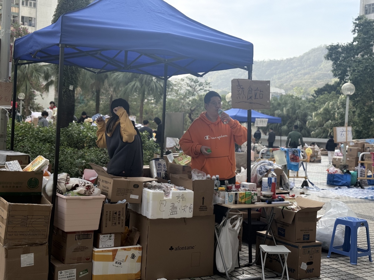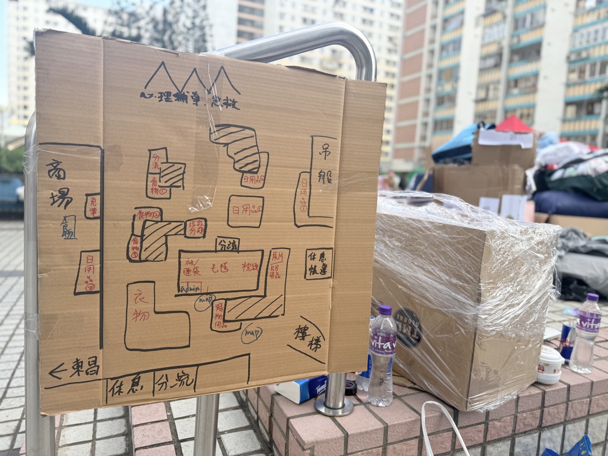Additionally, around 8 am this morning, volunteers began arriving on the rooftop of Kwong Fuk to distribute supplies to residents. In addition to common items like clothing and food, a pet supplies section was also available, providing dog food, cat food, and pet snacks. There were also homemade cardboard signs created by citizens indicating the distribution areas for various supplies, a rest area for reporters, and a charging station.