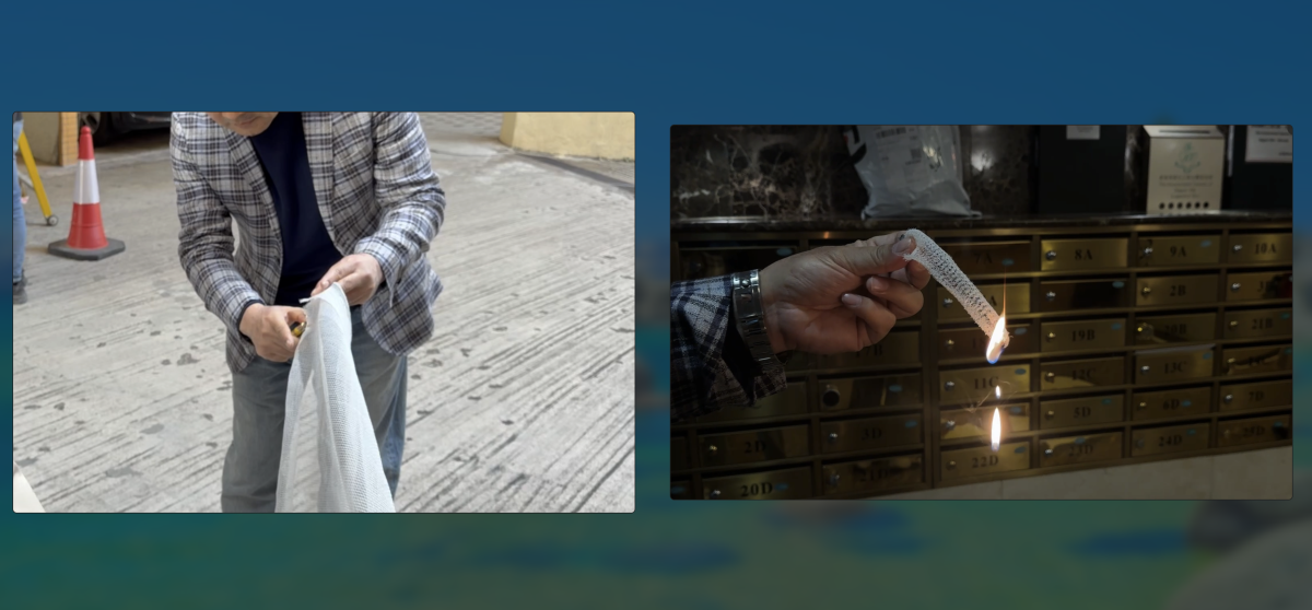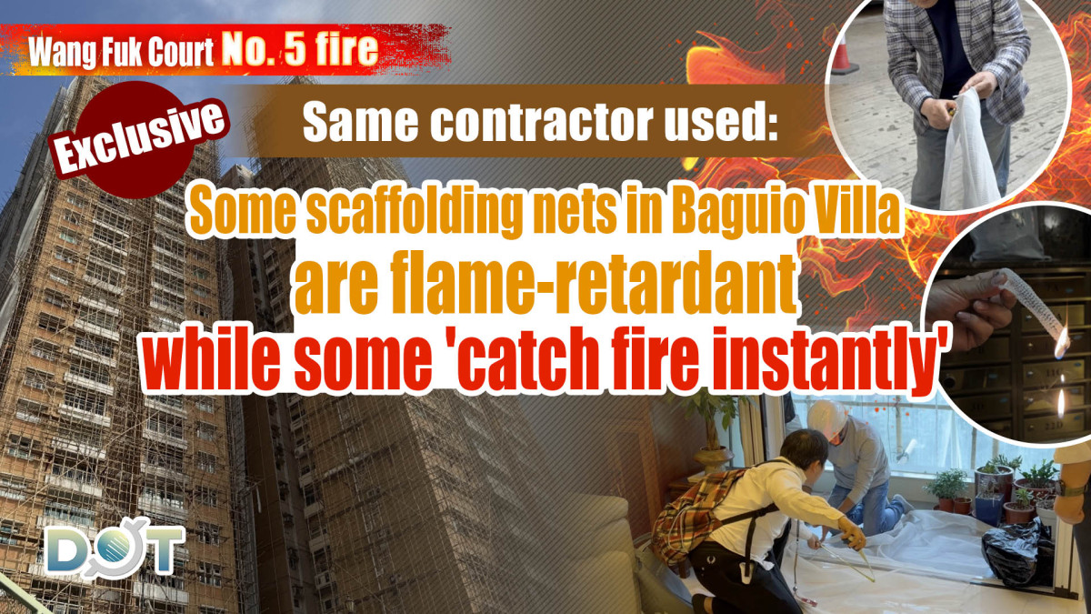"The same company is using the same materials—it's worrying if they're not up to standard," said several residents. Alarmed by the situation, some residents conducted their own tests by cutting pieces of the scaffolding netting and found that the nets "not only ignite easily but also drip sparks like a candle." Since the fire at Wang Fuk Court, repair work at Baguio Villa has been temporarily halted. Residents have repeatedly urged the management office to remove the scaffolding nets as quickly as possible, but their requests were initially refused. "My daughter has been so scared that she's woken up in the middle of the night several times," said Ms. Lam.