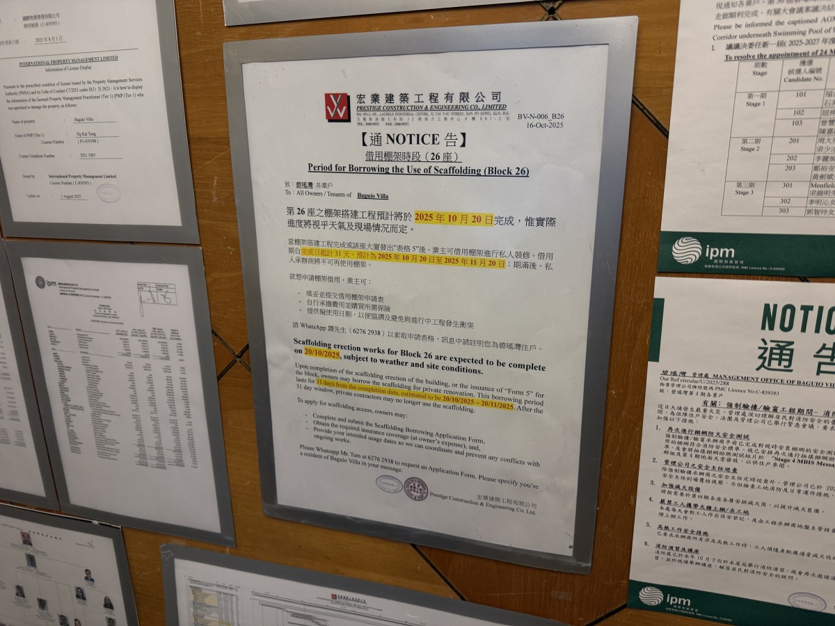 Ms. Chow, another resident, said she only became aware of the issue after being alerted by others and was shocked to learn that the contractor for their renovation was the same as that of Wang Fuk Court. Many residents expressed frustration over the lack of regular updates from the property management company to residents who are not part of the Owners' Corporation.