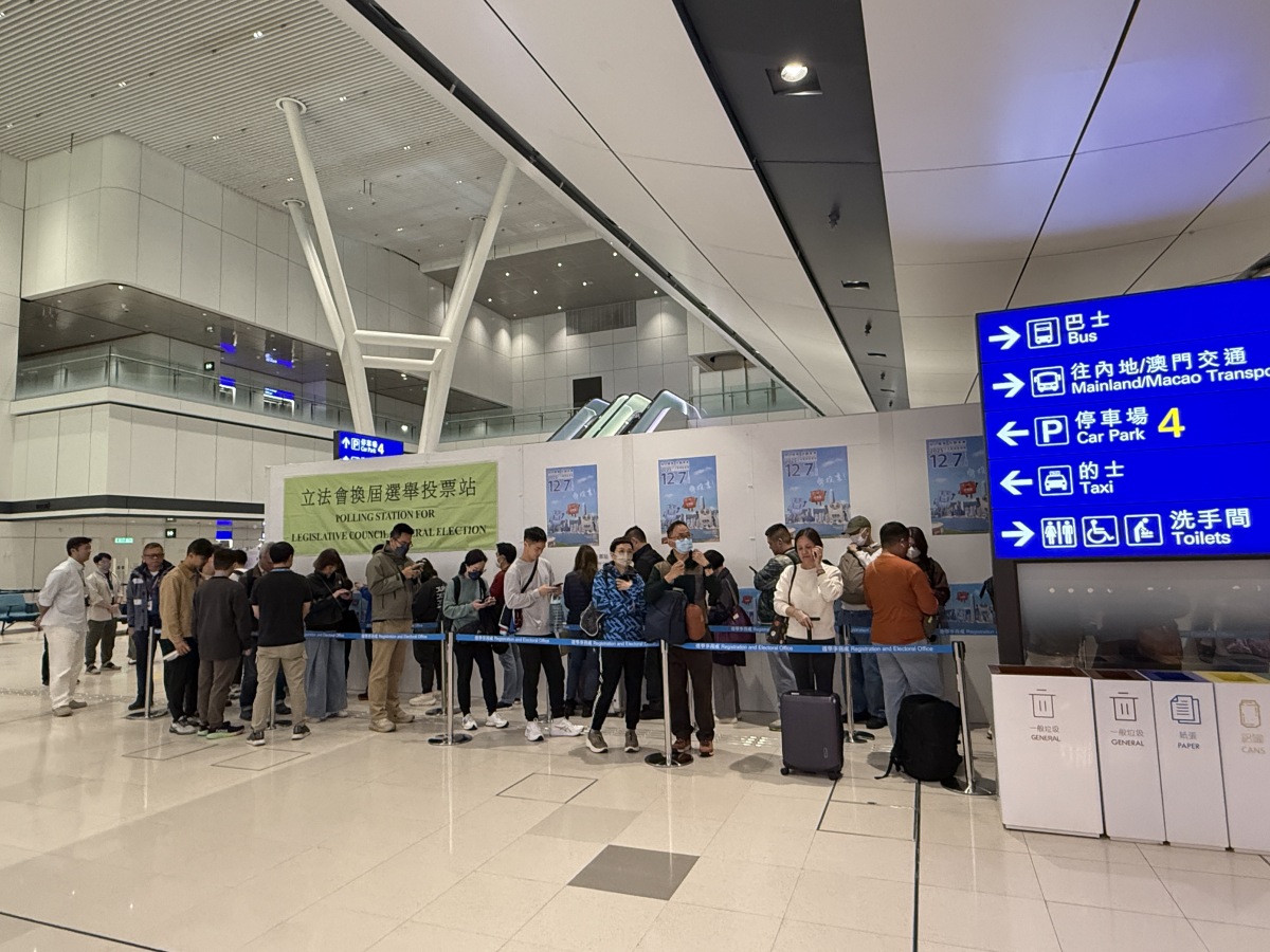 The 2025 LegCo General Election is being held today, Dec. 7, with voting hours extended from 7:30 a.m. to 11:30 p.m. Shortly after 7 a.m., DotDotNews reporters observed a growing line of voters waiting at the airport polling station. By the time the polling station opened at 7:30 a.m., at least 60 voters were already in line.