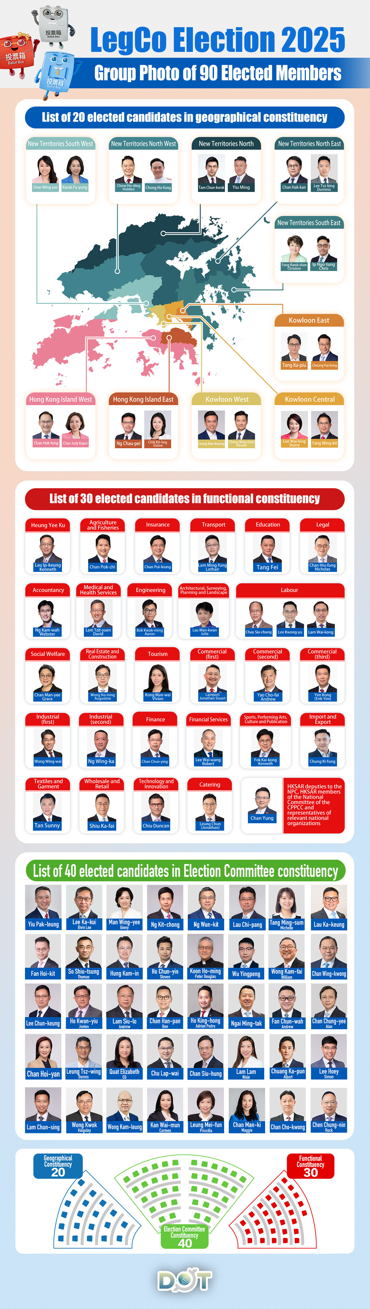 The full list of 90 members of the new LegCo was announced this morning (Dec. 8). DotDotNews has created an at-a-glance guide—a "group photo"—to help you quickly see all 90 elected members!