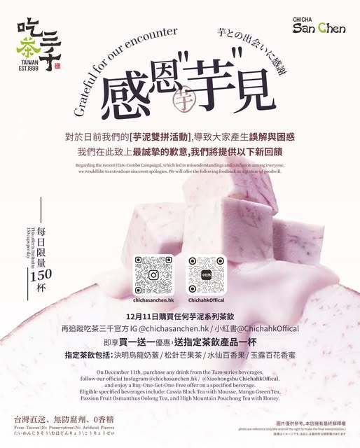 Popular tea brand CHICHA San Chen is launching a taro mud double set promotion. On December 11, customers who purchase any taro mud series drink and follow the official Instagram or Xiaohongshu account can enjoy a buy-one-get-one-free offer, receiving one complimentary designated drink.