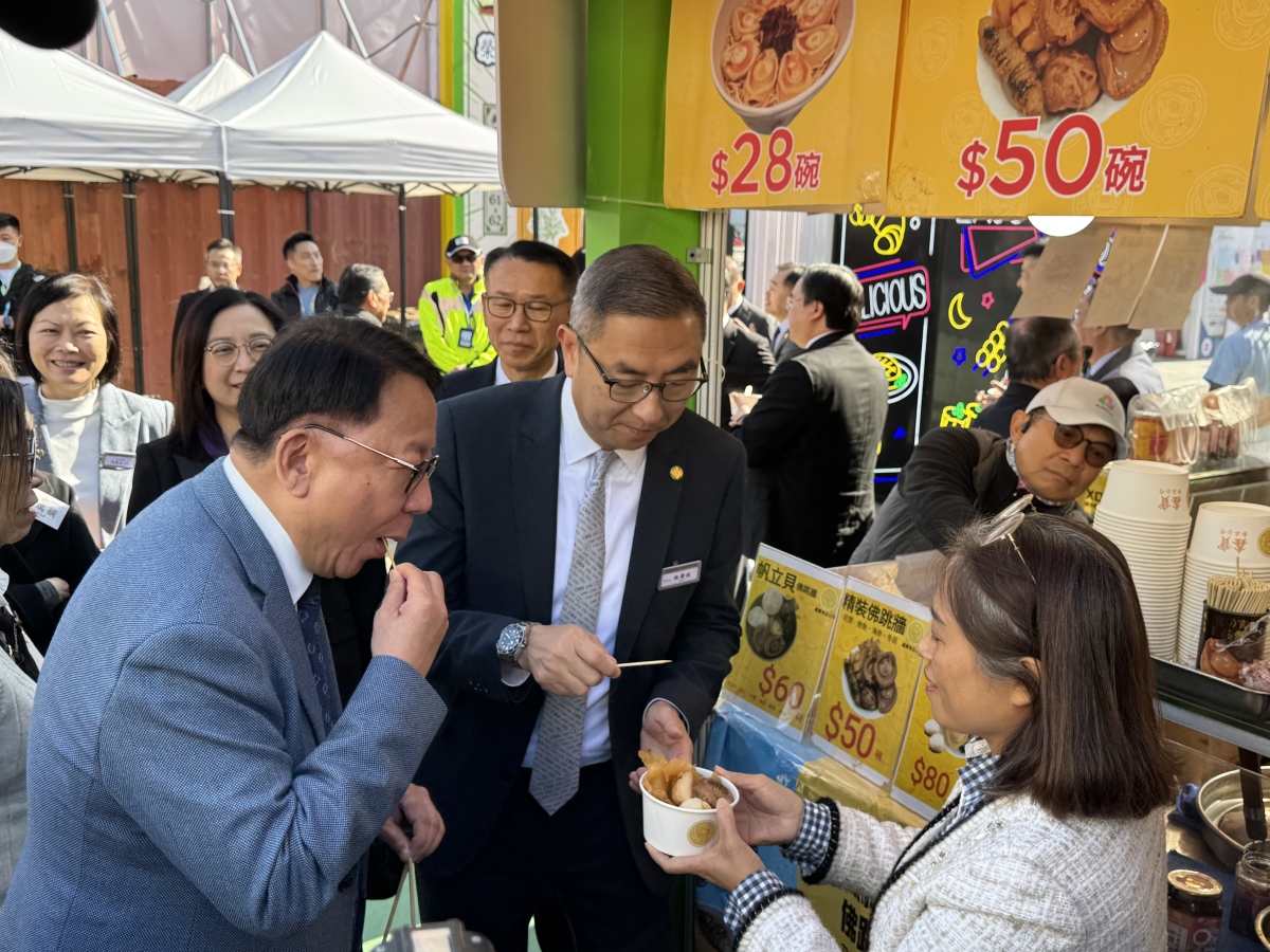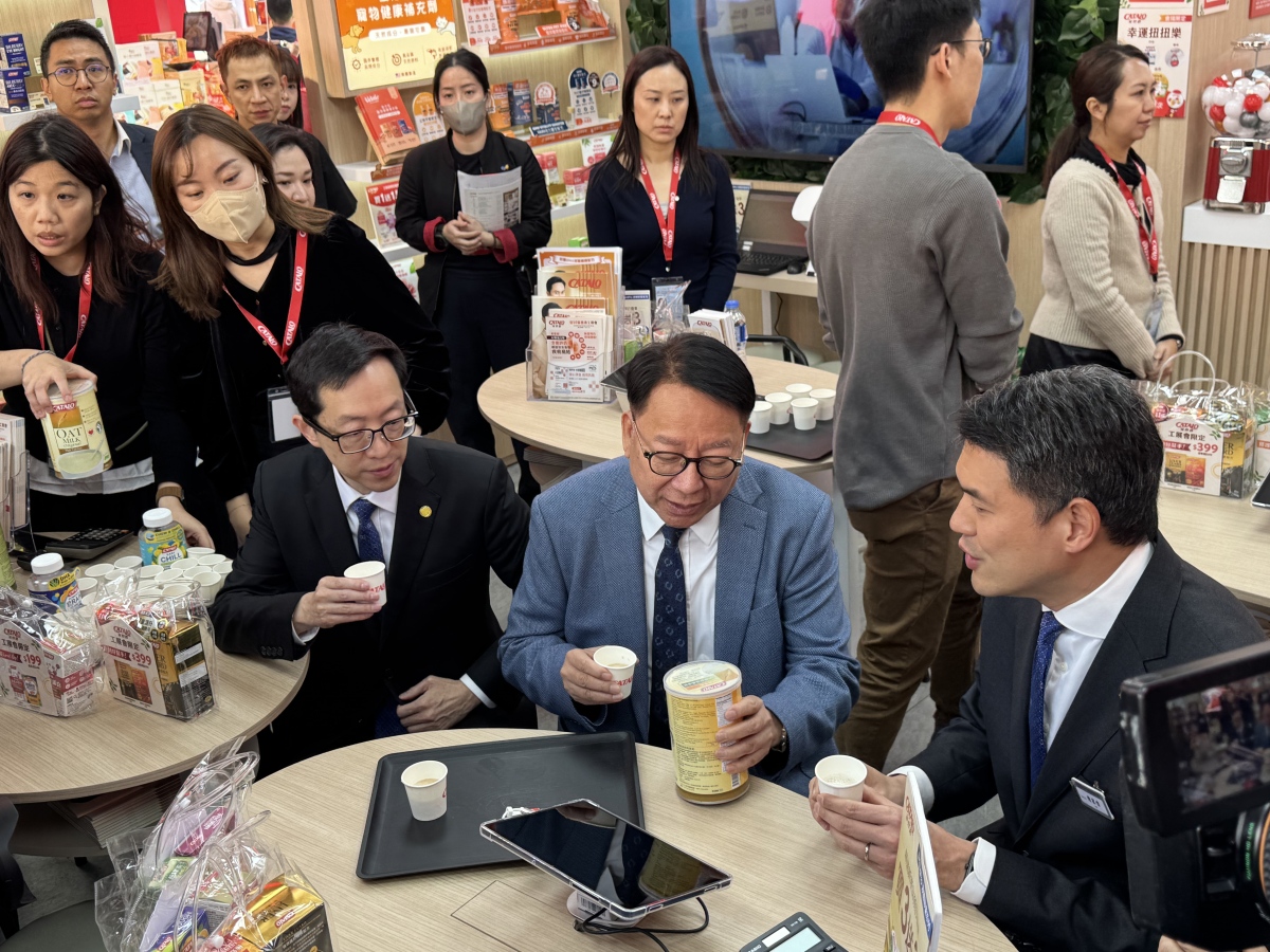 Mr. Chan and his delegation greeted vendors enthusiastically and sampled local delicacies such as fish maw chicken soup and beverages. Mr. Chan praised the flavors, emphasizing his support for Hong Kong's local brands and expressing his anticipation for the Expo's continued success.