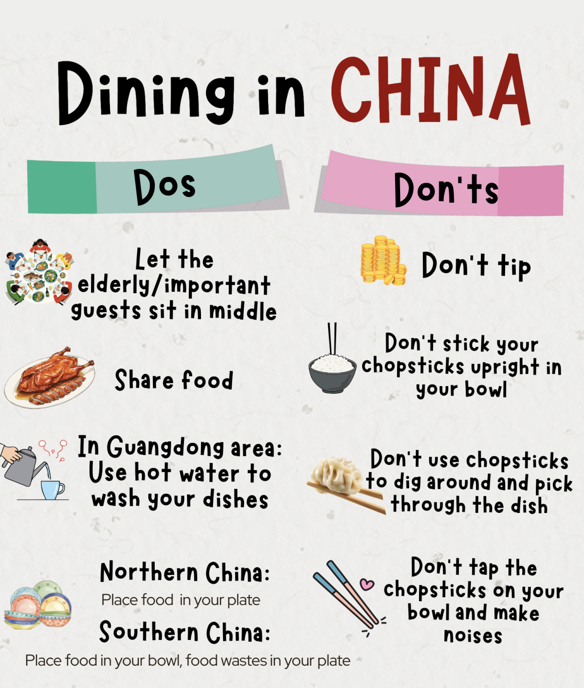 Customs can vary across China. In the north, it is common to place food directly onto your plate, using it as your main dining surface. In southern regions, however, food is placed inside the bowl, while food waste and other leftovers are set on the plate beside it. These subtle differences reflect local habits rather than strict rules.