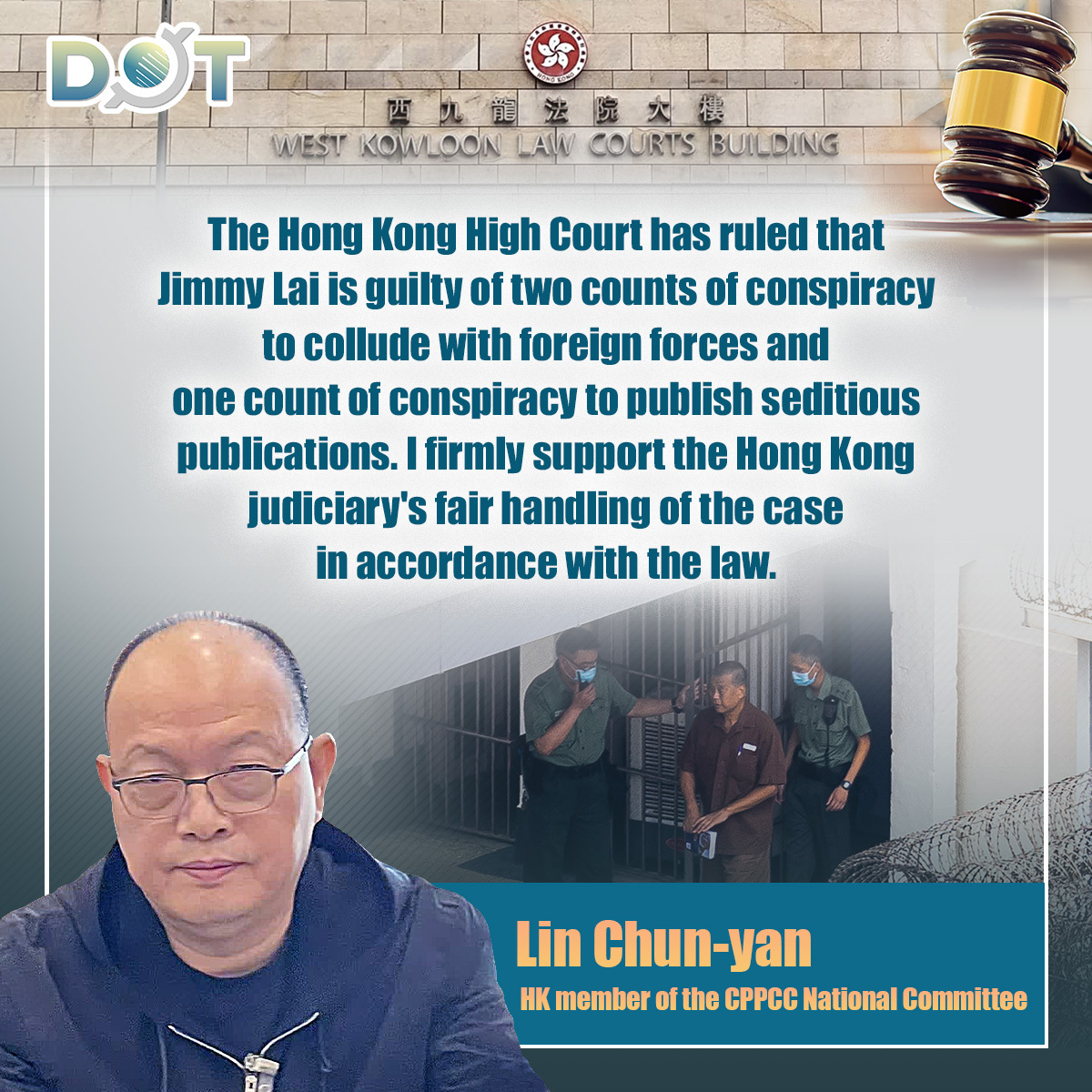The Hong Kong High Court has ruled that Jimmy Lai is guilty of two counts of conspiracy to collude with foreign forces and one count of conspiracy to publish seditious publications. I firmly support the Hong Kong judiciary's fair handling of the case according to the law.