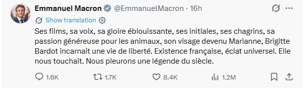 "Her films, her voice, her dazzling glory, her initials, her sorrows, her generous passion for animals, her face that became Marianne, Brigitte Bardot embodied a life of freedom. French existence, universal brilliance. She touched us. We mourn a legend of the century," Macron said.