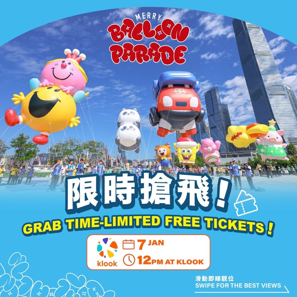 Looking for somewhere to go to kick off the new year? The grand finale event of "Merry Balloon Hong Kong," the "Merry Balloon Parade, "will take place on Jan. 11! Starting from 12 p.m. today (Jan. 7), the organizer will distribute over 10,000 free "Viewing Zone" tickets via Klook, with a limit of two tickets per Klook account.