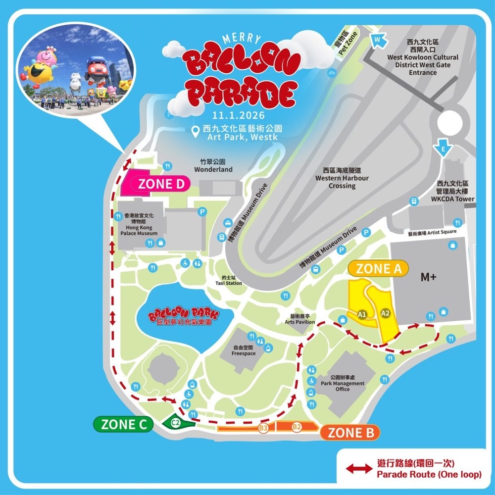 - Parade time: 2:00 p.m. to 4:00 p.m. (from M+ Museum to Hong Kong Palace Museum)