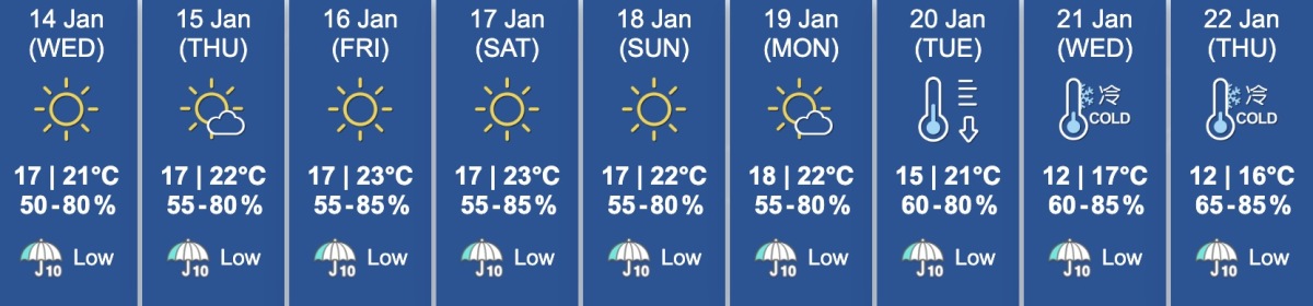 The Hong Kong Observatory stated that on Wednesday (Jan. 14), the weather will be generally clear, with early morning temperatures in the urban area around 17 degrees and a few degrees lower in the New Territories.