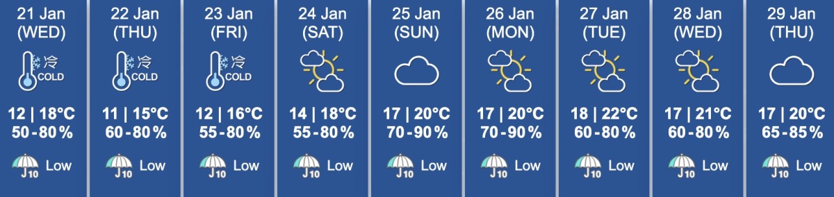 On Thursday and Friday (Jan. 22 and 23), it is expected to remain mostly cloudy with persistently cold conditions. Urban areas will see minimum temperatures of around 11–12°C, with temperatures in the New Territories dipping 2–3°C lower. Daytime temperatures are likely to rise only slightly.