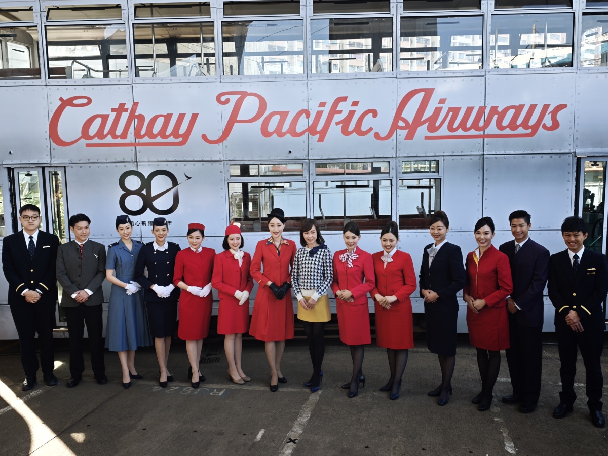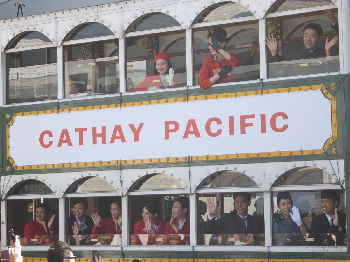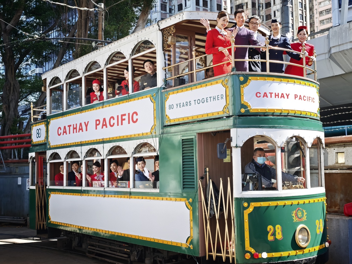 Founded in 1946, Cathay Pacific is about to celebrate its 80th anniversary. To mark this occasion, Cathay Pacific held an anniversary party tram parade today (Jan. 25), featuring several crew members dressed in classic uniforms from different eras, bringing aerial aesthetics to the tram tracks.