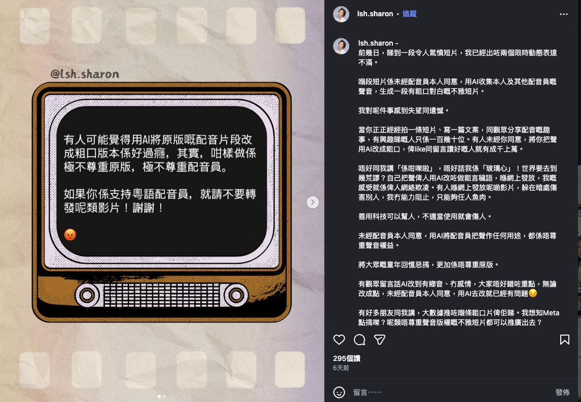 Sharon Leung, a renowned Hong Kong voice actress who dubs the character Shizuka in the anime, posted online expressing extreme anger after viewing the short video. She said that using AI to alter her voice for other purposes without her consent and parodying the childhood memories of the public is "extremely disrespectful to the original version and the voice actors," and using AI to alter her voice to include profanity made her "feel offended and subjected to cyberbullying."