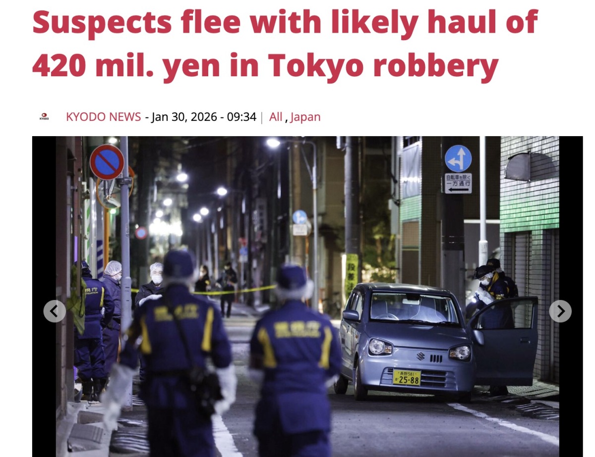 According to a report from Kyodo News on Jan. 30, five individuals—three Japanese nationals and two Chinese nationals—were robbed of suitcases containing 420 million yen in cash on a street in central Tokyo on the night of Jan. 29 at around 9:30 p.m.